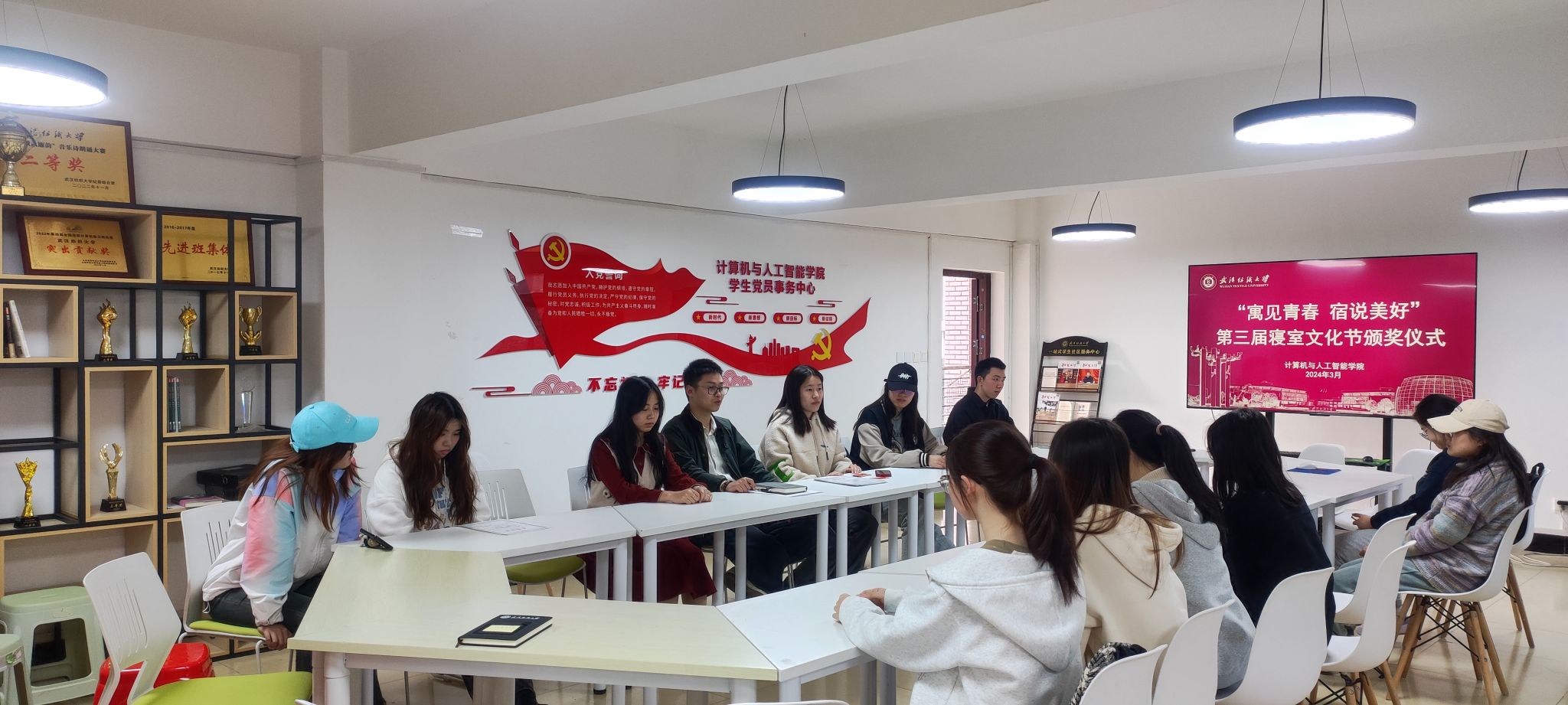 为进一步提升校园精神文明建设,充分发挥宿舍文化育人功能,努力营造文明健康的育人环境,充分展示计算机与人工智能学院学子的精神风貌,3月25日下午,学院团委学生会成长服务部在五栋二楼一站式举行计算机与人工智能学院2024年春季学期“院文明宿舍”表彰大会暨寝室文化节颁奖仪式。辅导员谢瑞清、陈祯、成长服务部成员以及获奖人员参加了此次活动。