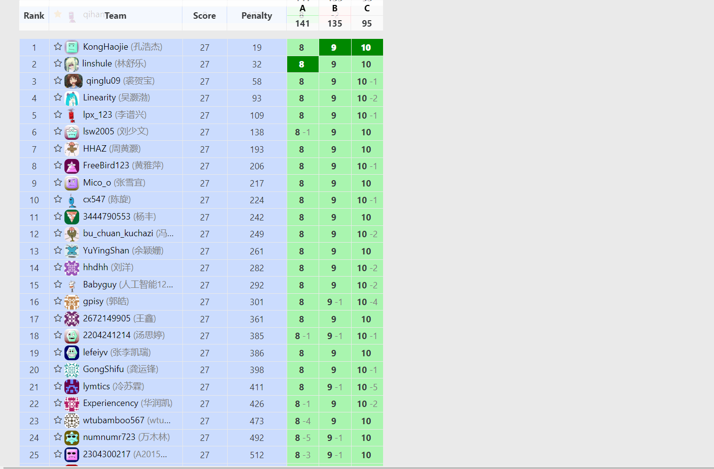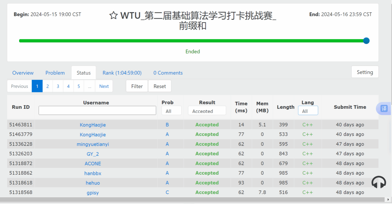 5月13日至23日,十天的线上打卡活动开展得热火朝天。同学们表现出色,有的同学每日清晨便投身学习,迅速高效完成打卡任务,思路清晰,解法新颖;有的同学遇到难题时,积极在群里与其他同学热烈讨论,携手攻克难关,充分展现团结协作精神;还有的同学不仅按时完成打卡,还对算法进行优化改进,力求完美。贪心算法、前缀和、二分查找、深度优先搜索与广度优先搜索、动态规划等,每次挑战都是成长的契机。参赛者们在知识的征途上奋勇前行,不断突破自我,彰显出惊人的学习能力和解决问题的高超技巧。