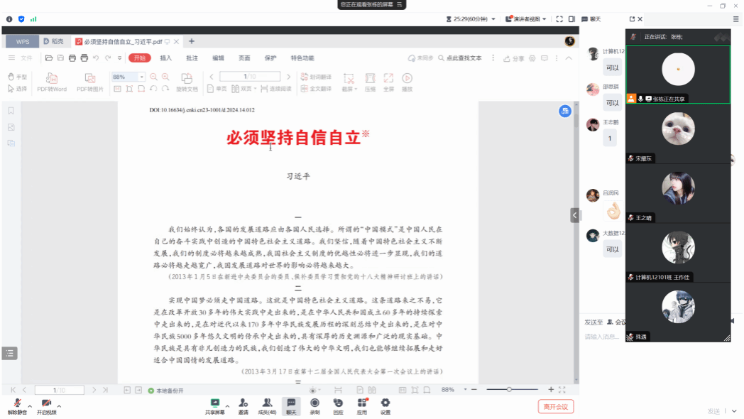 活动伊始,全体学生党员在张栋同志的带领下重温了入党誓词。随后,与会党员集中学习了习近平总书记重要论述:《必须坚持自信自立》(原载《求是》2024年第14期),全体党员充分认识到“四个自信”的重要意义,要把文化自信融入精神气质与文化品格中,养成昂扬向上的风貌和理性平和的心态。