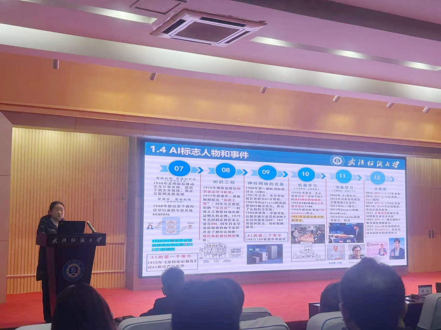 胡新荣教授的报告从人工智能的基础概念、发展历程、大模型技术及其应用实践等多个方面展开。她从AI基础讲起,阐述AI火爆的背景,涵盖国家战略、算力发展、算法创新、市场需求、学科融合、资本与政策保障以及数据爆炸等多方面因素,介绍诸多标志人物和事件,让参会人员对AI的发展脉络有了清晰的认识。