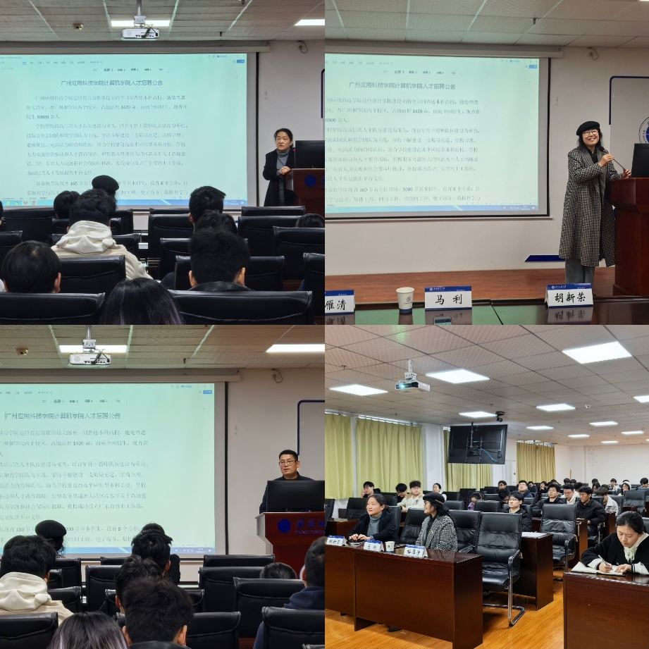 胡新荣向大家详细介绍了广州应用科技学院计算机学院的发展前景与合作方向,激励研究生们踊跃投递简历,积极把握春季招聘的宝贵就业契机。马利介绍了广州应用科技学院计算机学院的校情校史、招聘需求、薪资待遇等内容,让学生们对广州应用科技学院计算机学院有了更全面的认识。同时,马利还分享了实习生和毕业生在学校的工作经历和成长故事,激发了同学们的求职热情。