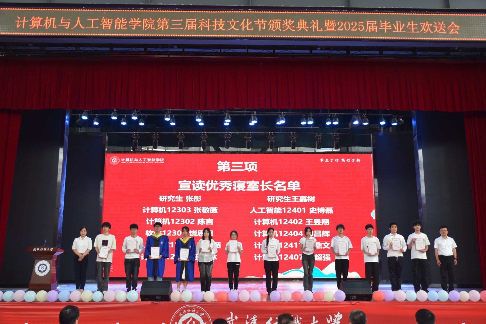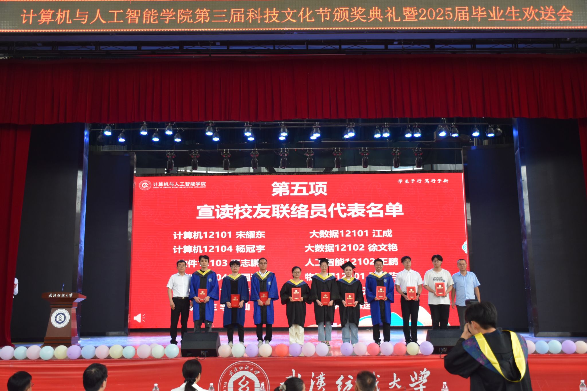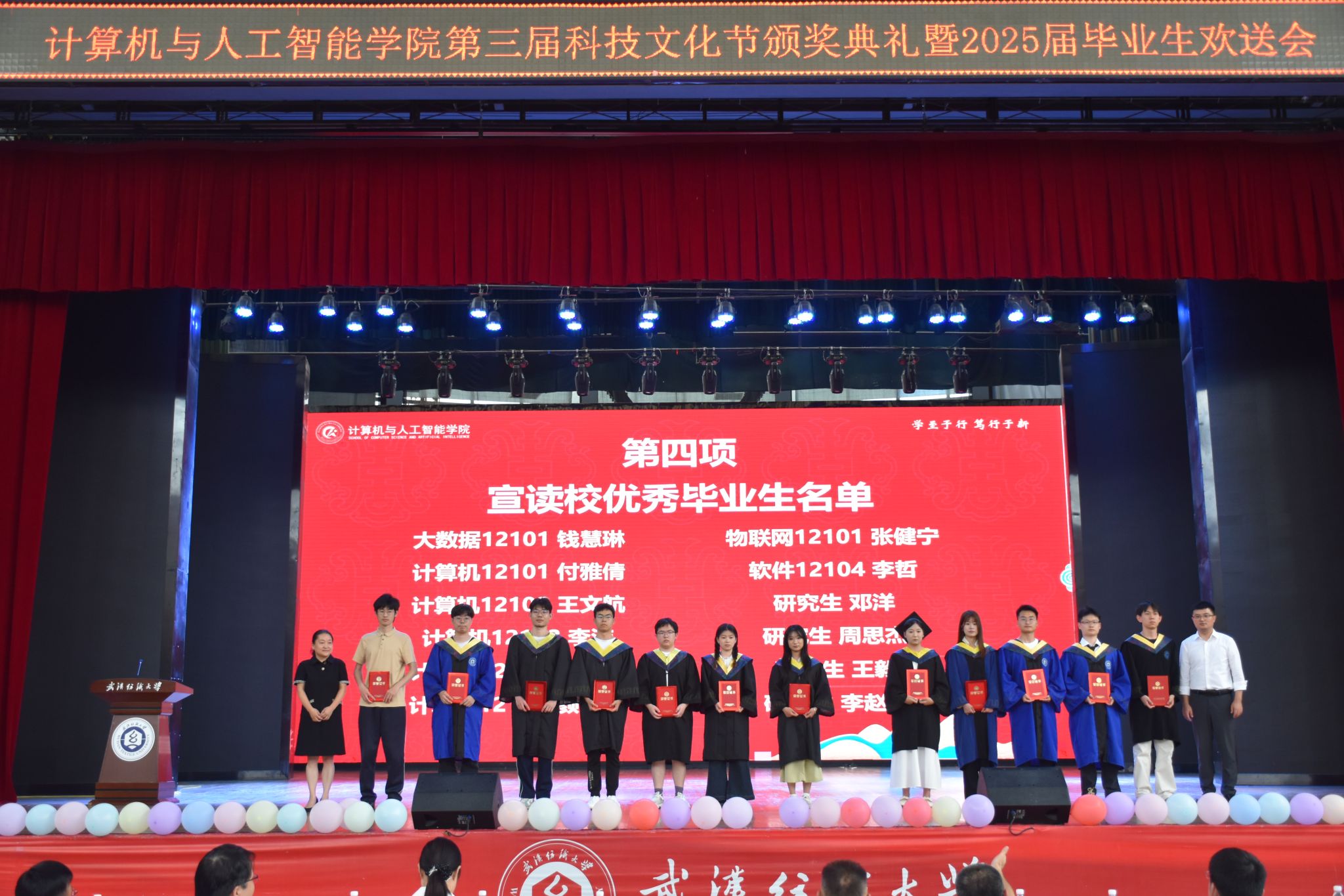 6月12日,计算机与人工智能学院在大学生活动中心演播厅举办了“筑梦计智 逐梦未来”为主题的第三届科技文化节颁奖典礼暨 2025届毕业生欢送会。校党委副书记、副校长罗锦银,学工部、研工部、校团委、教务处、招就处、校友处等部门负责人,全体院领导、教职工,本科生、研究生、毕业生家长代表、校友代表等1000余人齐聚一堂,共同见证这一难忘时刻。