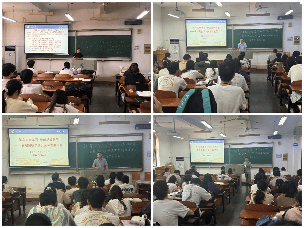 7月29日上午,计算机与人工智能学院在03-111、112、113教室开展暑期留校学生慰问暨安全和发展大会。院长胡新荣、院党委书记晏伟、副院长魏雄、副院长彭涛、党委副书记向涛和专任老师李丽、朱强、丁磊、熊明福、万红艳,辅导员张栋、汤若釴、余梦帆参加慰问,与全体留校本科生见面交流。