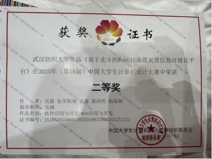 在第 18 届中国大学生计算机设计大赛中,吴渊老师带领吴霜、张李凯瑞、王鑫、郭沛然、杨淑娴五位本科生组成的团队,聚焦地震灾害应急需求,研发出《基于北斗的 WebGIS 地震灾害信息可视化平台》。该平台将北斗定位技术与 WebGIS 地理信息系统相结合,实现了地震灾害数据的实时可视化呈现与高效分析,为灾害应急决策提供了有力支撑。最终,团队在全国总决赛中荣获软件应用与开发 - Web 应用与开发类别国赛二等奖,充分体现了学院在计算机应用创新领域的教学成效。