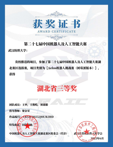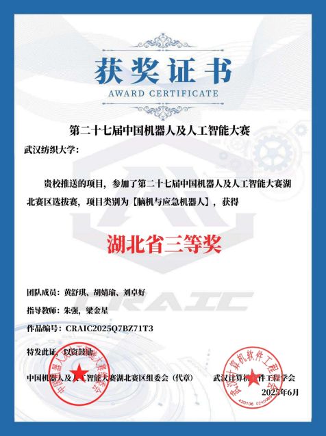 梁金星老师在该赛事中收获颇丰。在湖北省赛区选拔赛阶段,他指导的团队一举拿下1 项一等奖、3 项三等奖:其中,袁泽鸿、黄耀、杨周义团队的 “脑机与应急机器人” 项目,凭借前沿的脑机接口技术与应急场景适配能力,斩获湖北省一等奖;黄舒琪、胡婧瑜、刘卓好团队,钱泽宣、李瓯翔、饶承坤团队的 “脑机与应急机器人” 项目,以及王申、王俊皓、刘襄郧团队的 “Aelos 机器人挑战赛(树莓派版本)” 项目,均获湖北省三等奖。而在全国总决赛中,梁金星老师指导的团队再传捷报,收获1 项全国二等奖、1 项全国优胜奖,实现了从省级赛场到全国赛场的持续突破。