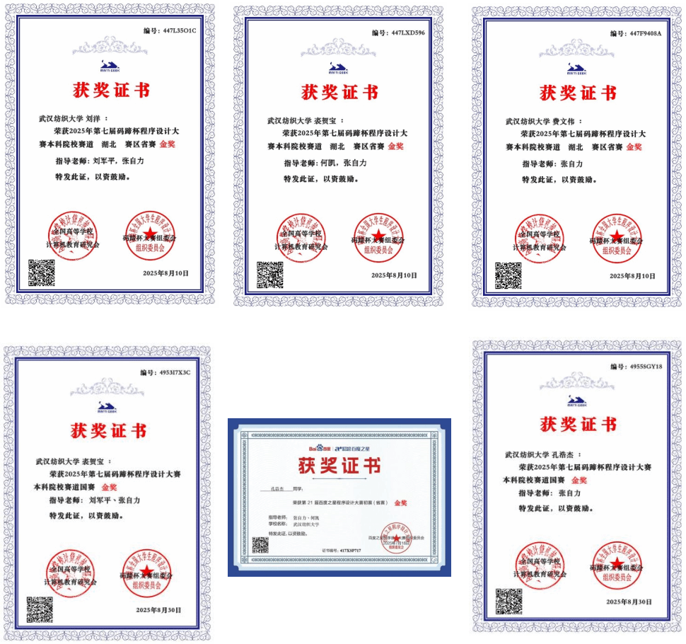 张自力老师作为指导核心,带领学生在百度之星、码蹄杯两大顶尖程序设计赛事中掀起 “夺金热潮”。在第七届码蹄杯程序设计大赛中,孔浩杰同学凭借出色的算法设计与代码实现能力,斩获本科院校赛道国赛金奖;裘贺宝同学与团队紧密配合,同样拿下国赛金奖;在湖北省赛区比赛中,刘洋、费文伟、裘贺宝三位同学分别斩获省赛金奖,最终学院以 “2 金 3 银” 的佳绩在码蹄杯赛事中站稳脚跟。此外,在第 21 届百度之星程序设计大赛初赛(省赛)中,孔浩杰同学再次发力,将省赛金奖收入囊中。这些成绩的取得,不仅是学生个人努力的结果,更离不开张自力老师与何凯、刘军平等协同指导教师的悉心培育,体现了学院程序设计教学团队的强大实力。
