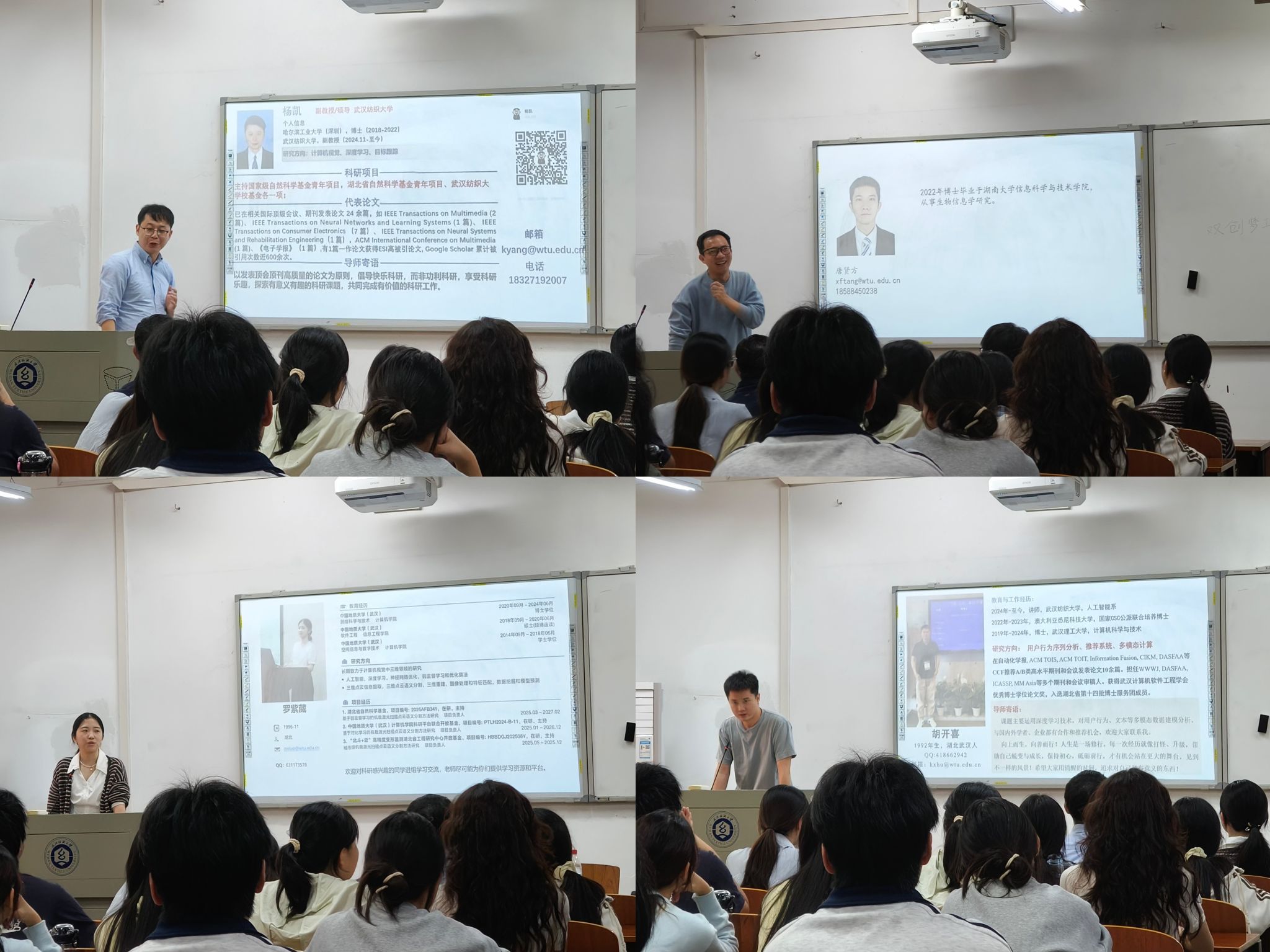 在导师介绍环节,到场的阳光导师依次上台发言。颜小运老师、王晨老师、杨凯老师、唐贤方老师、罗紫葳老师、胡开喜老师等,分别从个人研究领域、科研成果、团队氛围及对学生的培养要求等方面进行了详细介绍,涵盖了人工智能、计算机视觉、自然语言处理、多媒体信息处理、智慧教育、智慧健康、推荐系统等多个研究方向,为同学们提供了丰富多样的选择。