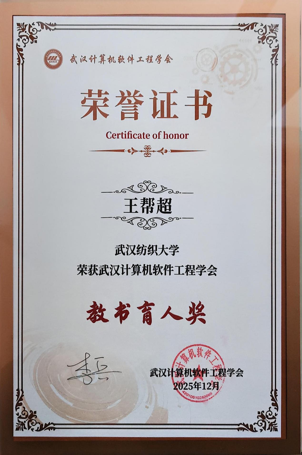 王帮超老师荣获武汉计算机软件工程学会“教书育人奖”