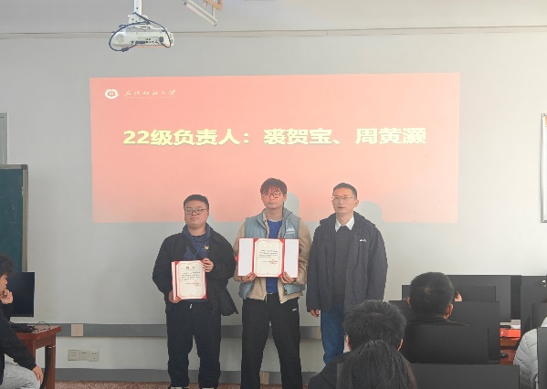 活动进入庄重的聘书颁发环节,学院彭院长、向书记分别为22级负责人(会长裘贺宝、副会长周黄灏)及23级负责人(会长费文伟、副会长孔浩杰、林舒乐)颁发了聘书,以表彰他们过去一年在俱乐部组织、赛事筹备等方面所做的辛勤付出与重要贡献。