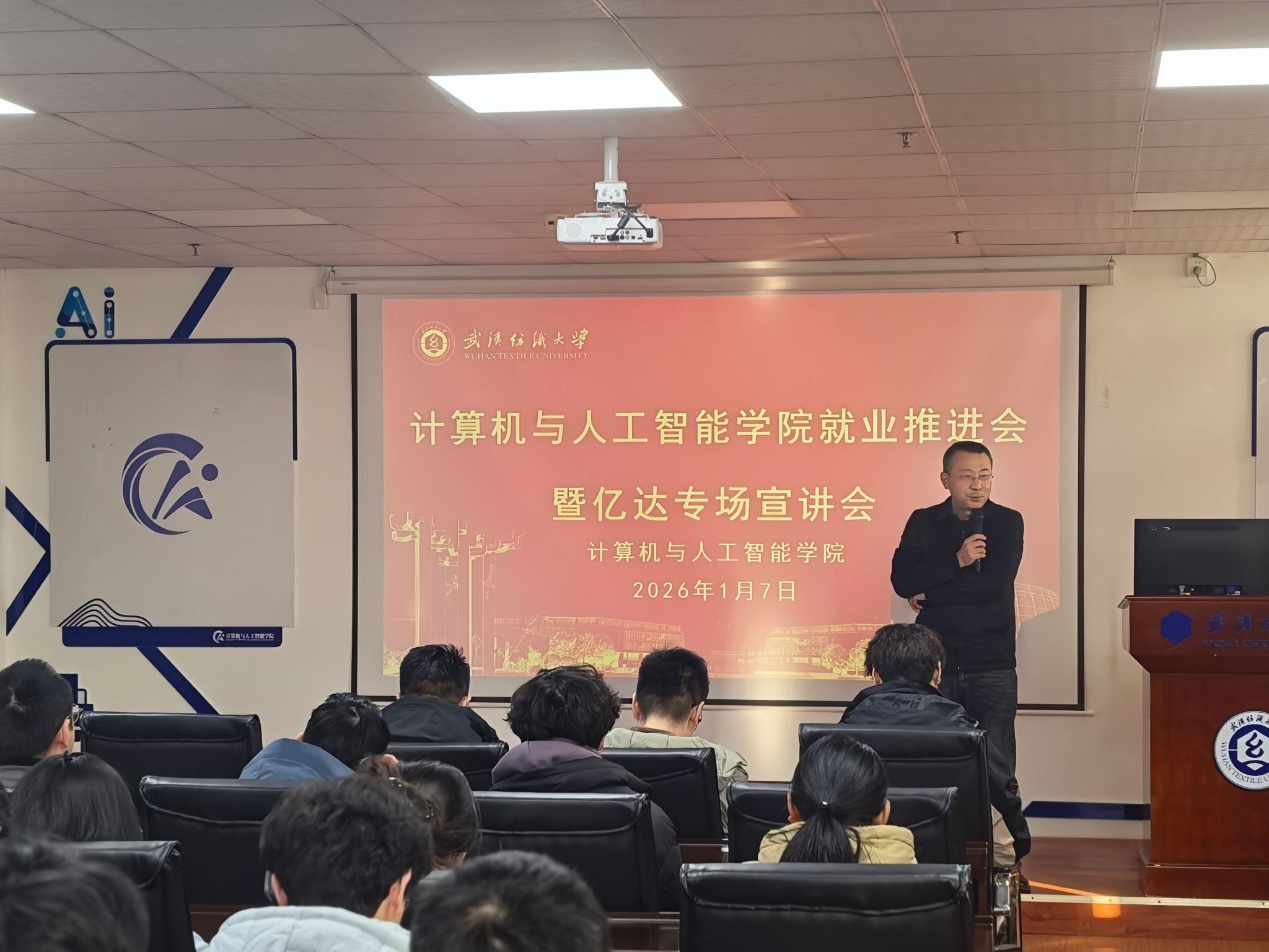为做好2026届毕业生就业工作,助力毕业生高质量就业,搭建精准高效的校企人才对接平台,1月7日,武汉纺织大学计算机与人工智能学院携手亿达科技有限公司,在学校崇祯楼A4030成功举办了专场招聘会,吸引了众多毕业生参与,取得了良好成效。。