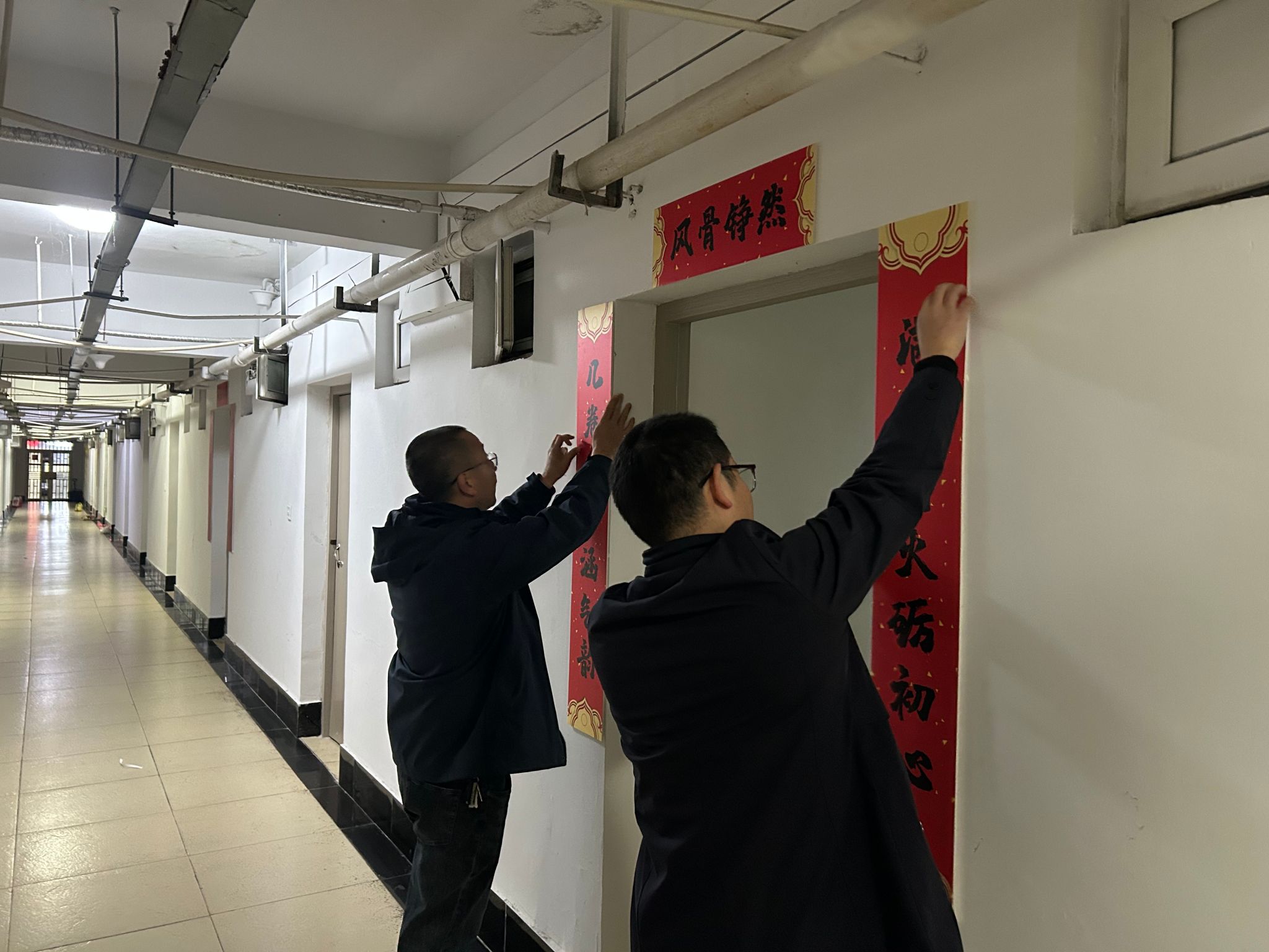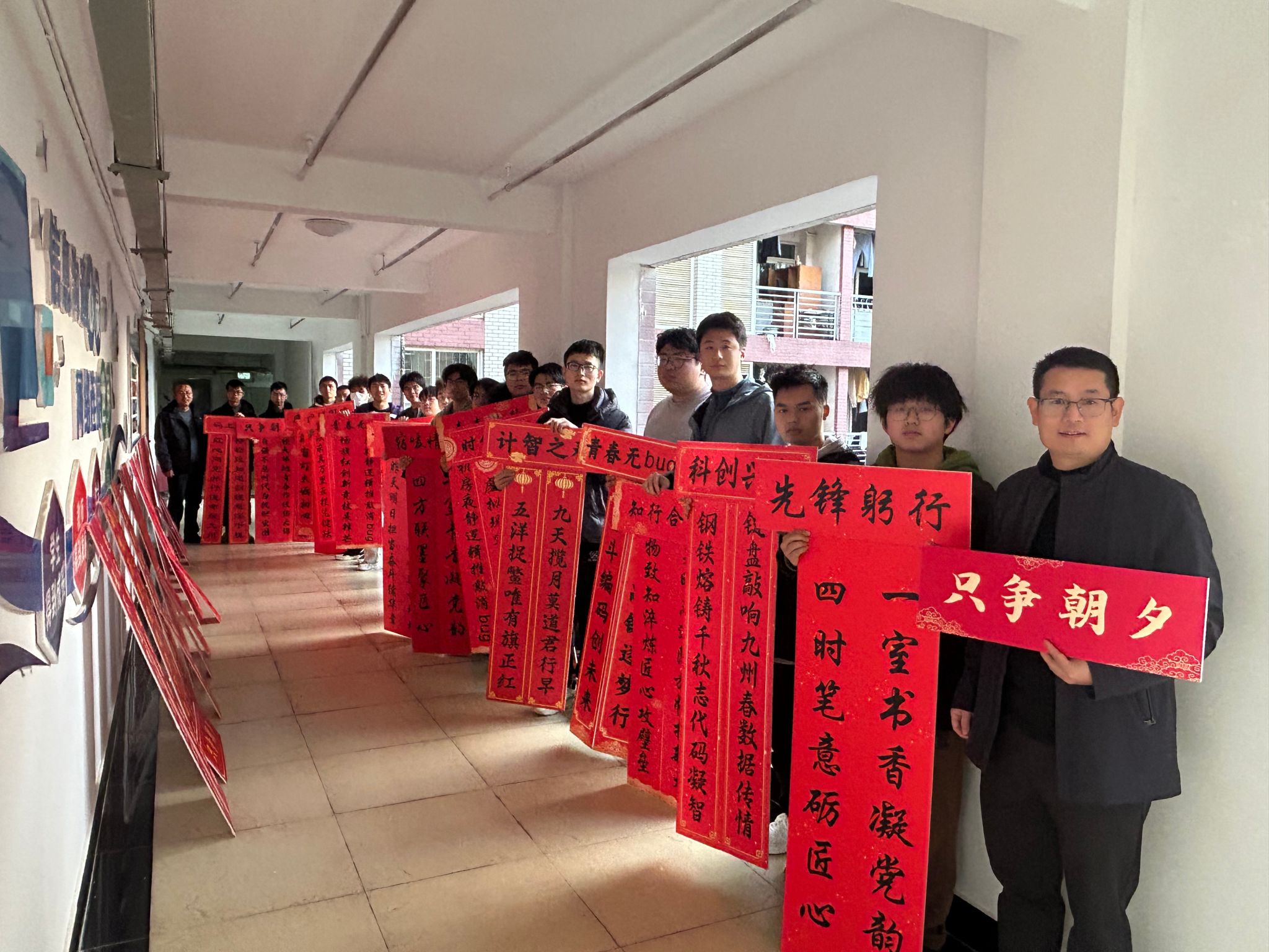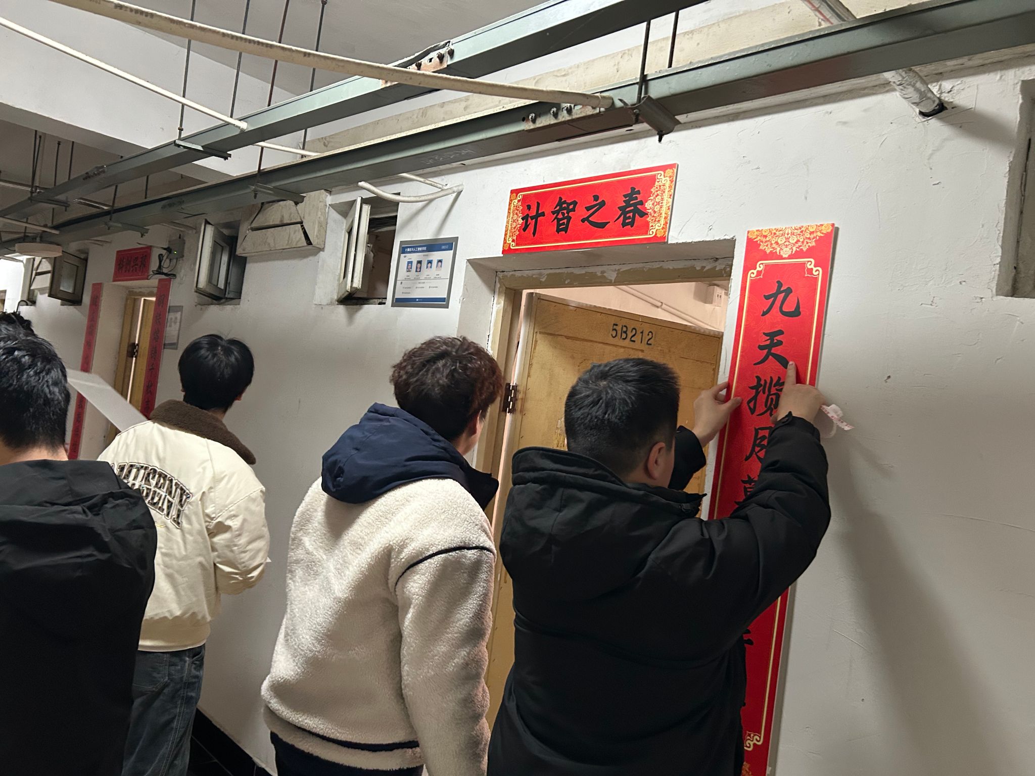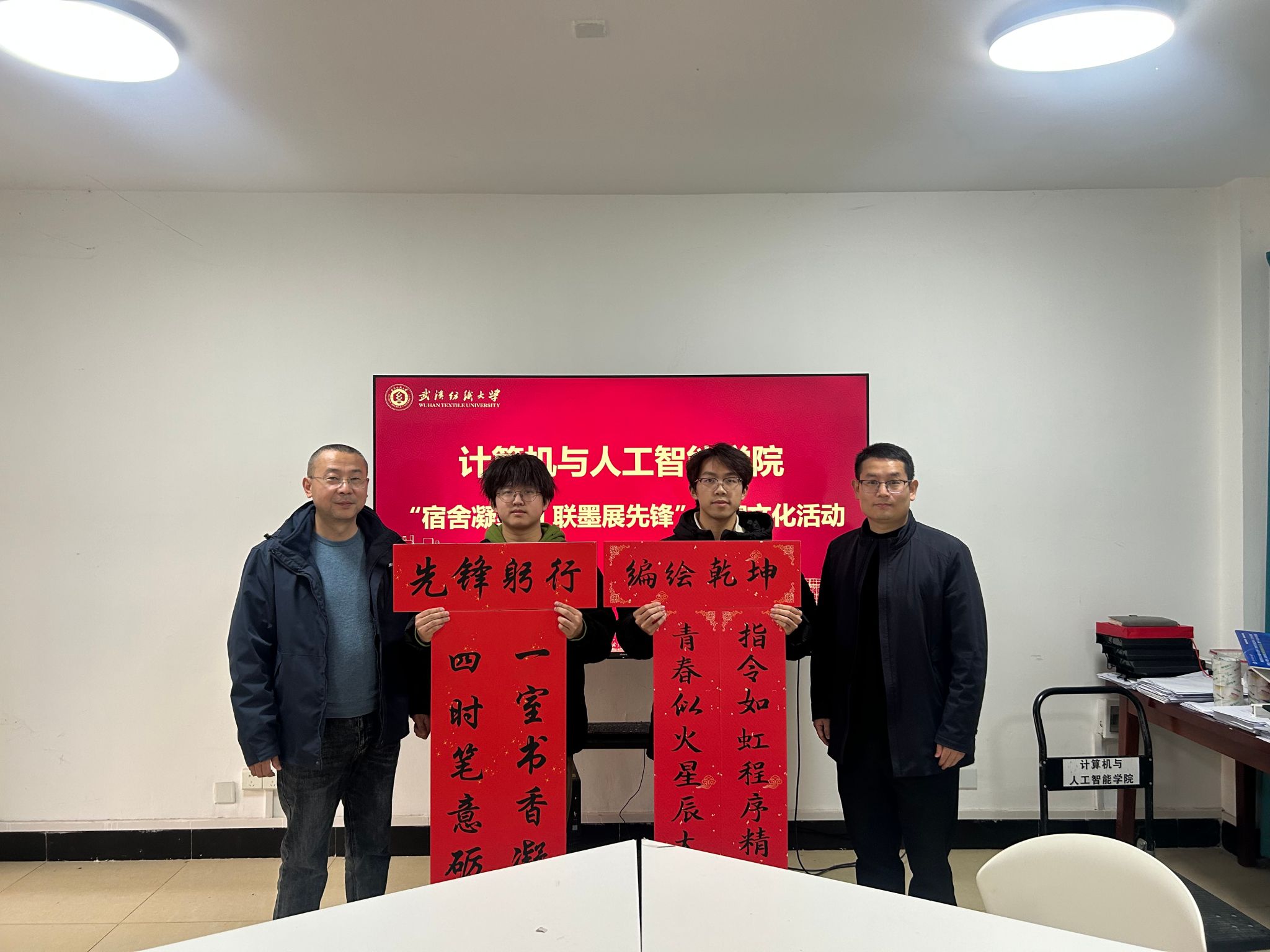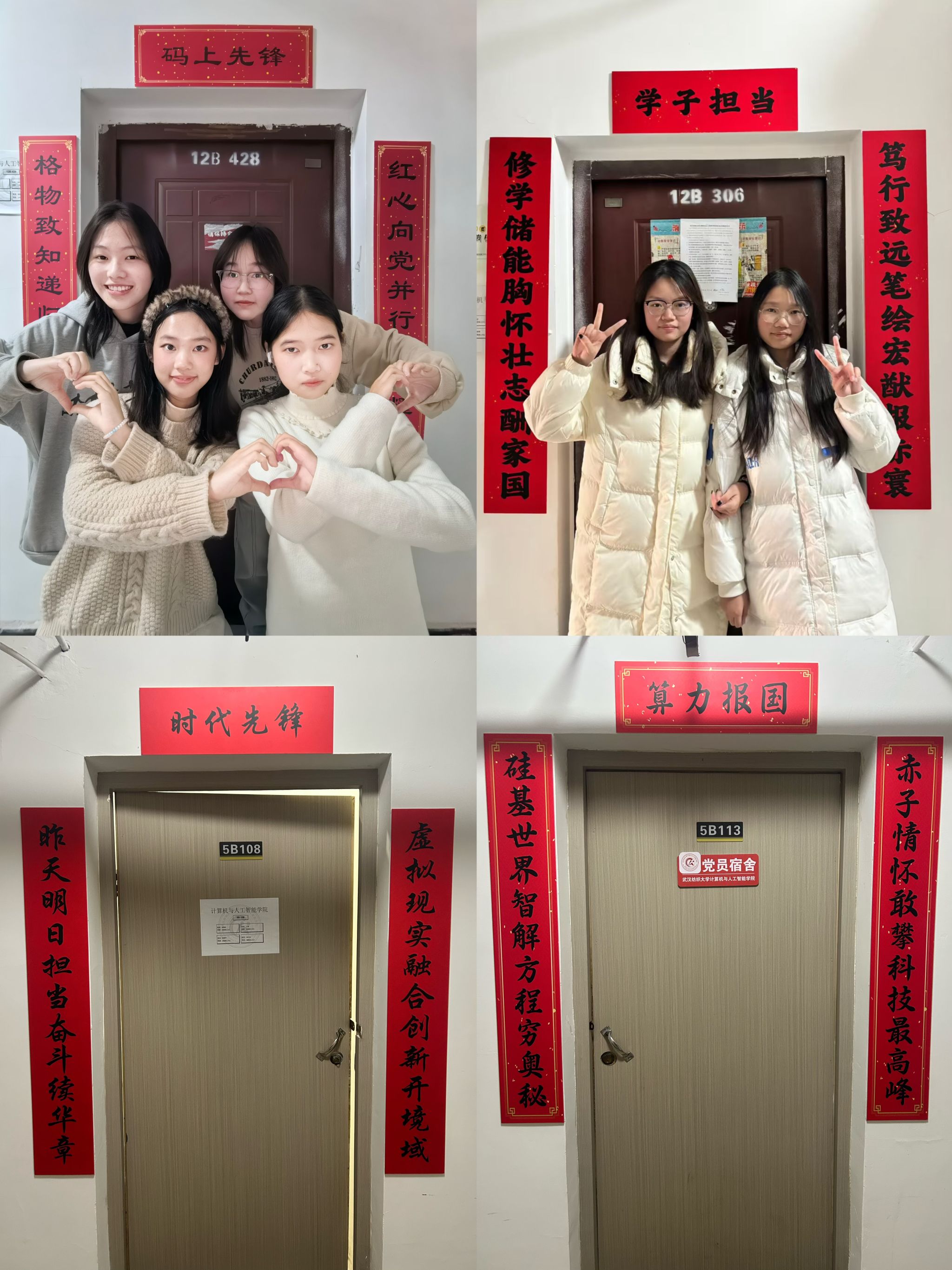 活动自启动以来,得到了学院各寝室同学的积极响应和热情参与。同学们以寝室为单位,围绕“红韵”主题,巧妙构思,将红色元素、励志名言与传统楹联相结合,充分发挥创意,精心装点“小家”。计算机与人工智能学院党委书记晏伟、副书记向涛,在活动中亲自为寝室张贴对联,对同学们表达新春的祝福!