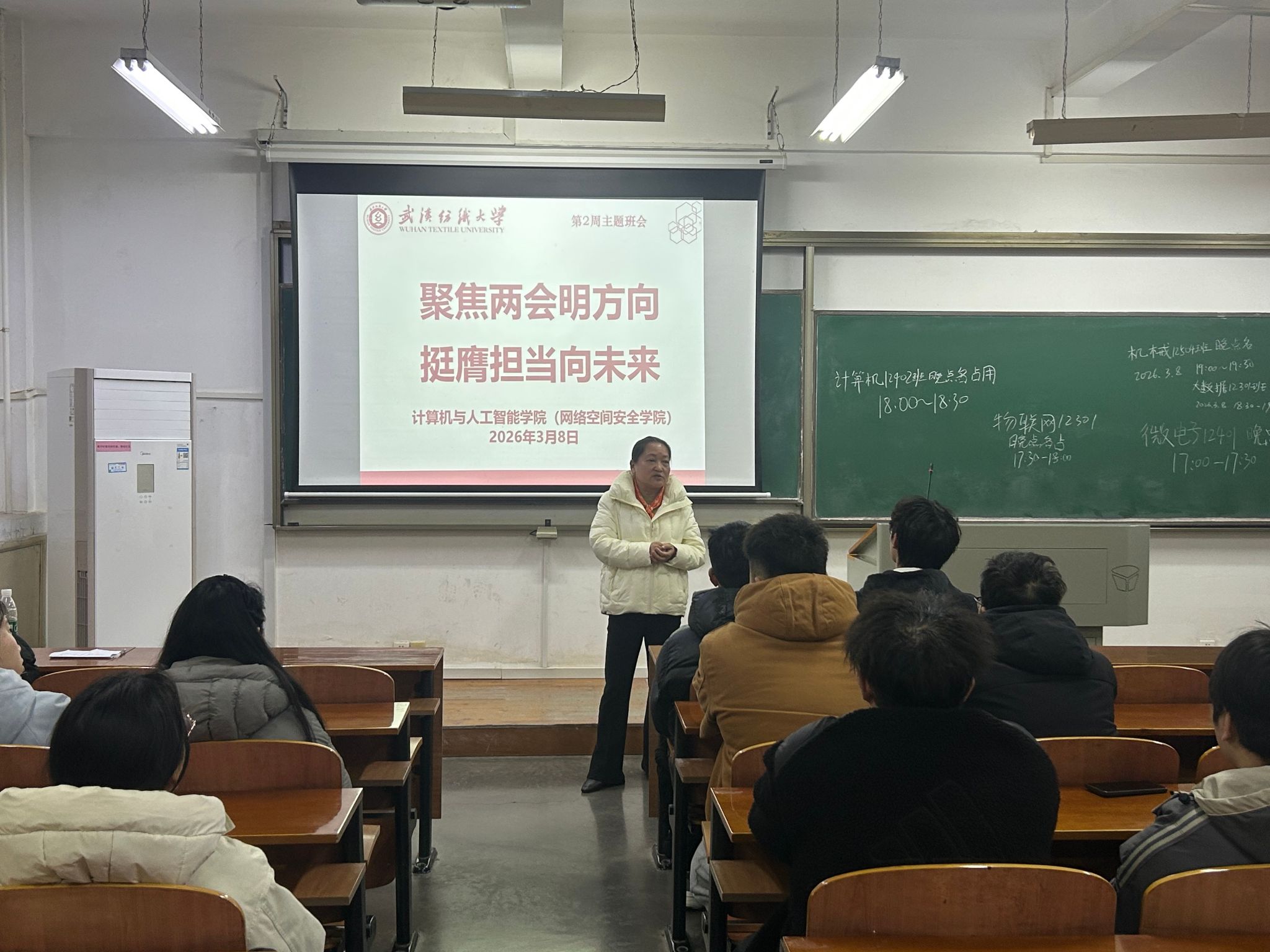 在计算机 12401 班、12402 班的班会中,胡新荣院长结合 2026 全国两会精神,为同学们带来一堂兼具高度与温度的 “思政 + 专业” 课。她生动解读,人工智能作为新质生产力核心引擎,已成为国家战略布局的关键方向;政府工作报告对 6G、人工智能、脑机接口等前沿领域的重点部署,与湖北省建设全国构建新发展格局先行区的战略定位高度契合。他勉励同学们立大志、明大德、成大才,把个人理想融入国家发展与区域建设大潮,在深耕专业中探寻乐趣、收获成长,努力成为智能时代的创新者与建设者。