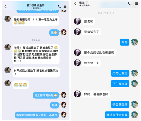 近日,参加完浙江大学研究生复试面试成绩不错的计算机与人工智能学院11801班张尧同学给辅导员老师第一时间发来感谢短信:“心里的大石头终于落地了,这里的无线网比宿舍快多了,感谢学院老师的暖心安排,希望自己能取得一个好成绩,对得起自己一直以来的努力和学院对我们考研同学的用心付出。” 已经被国防科技大学拟录取的软件11801班梁亚玲同学第一时间向辅导员报喜,感谢学院为他们复试“保驾护航”。