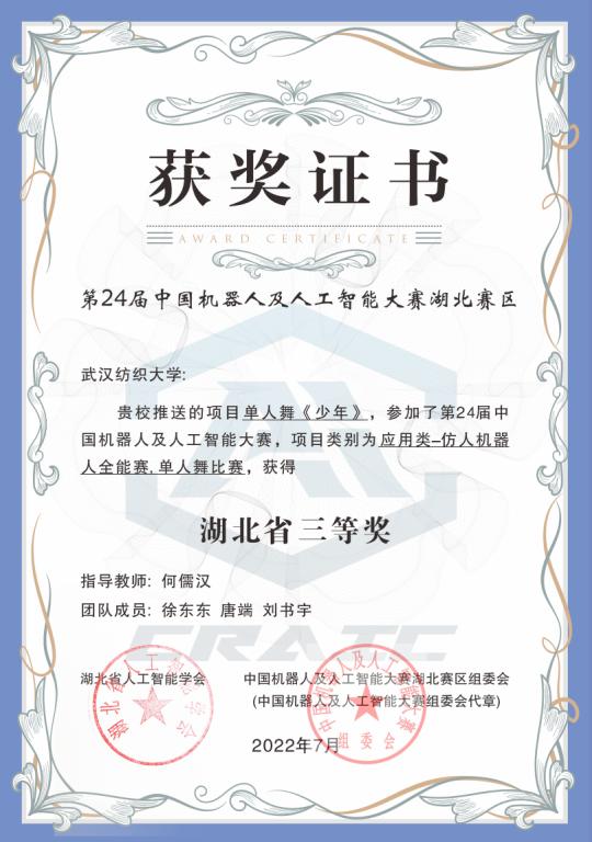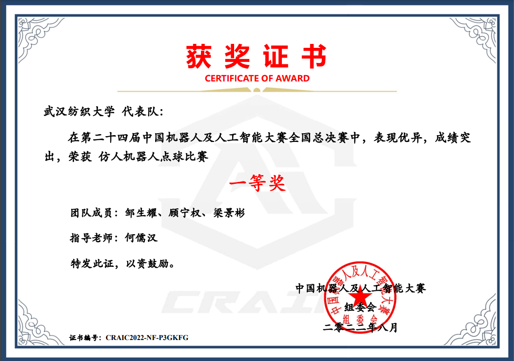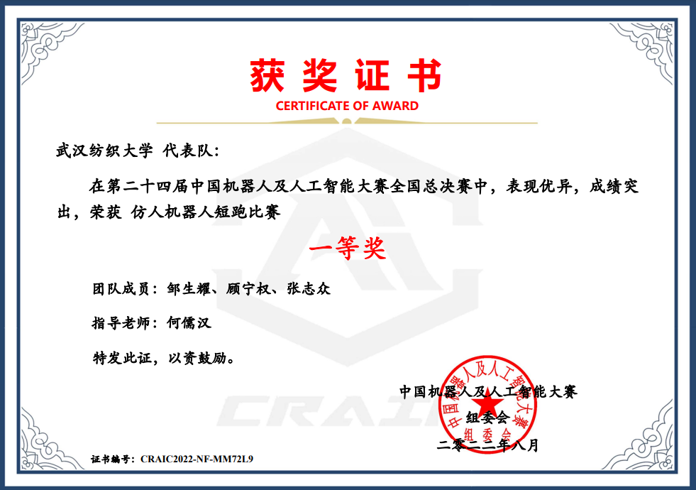 由计算机与人工智能学院何儒汉老师指导的三支代表队:学生邹生耀、顾宁权、梁景彬参加的仿人机器人点球比赛获得全国总决赛一等奖;学生邹生耀、顾宁权、张志众参加的仿人机器人短跑比赛获得全国总决赛一等奖;学生徐东东、唐端、刘书宇参加的单人舞项目获得省级比赛三等奖。
