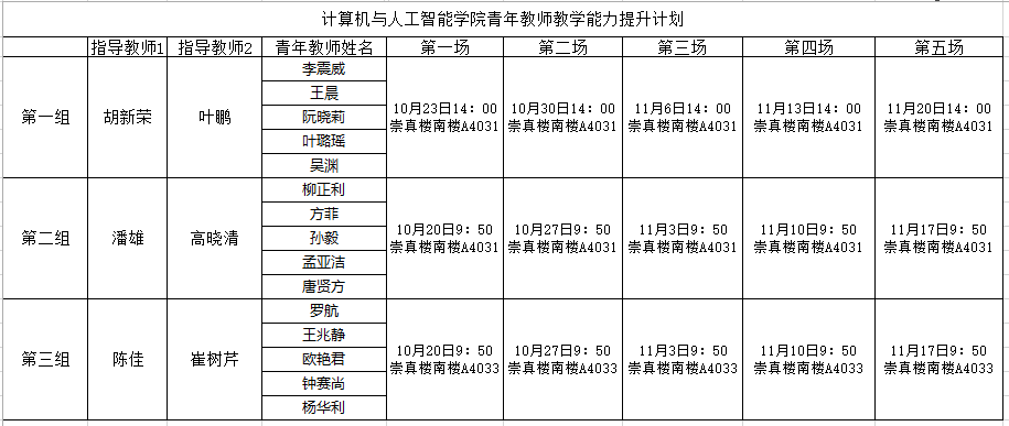 为了提高青年教师的综合素质,培养青年教师立德树人的意识,加快青年教师的教学能力提升,帮助他们尽快站稳讲台、站好讲台,自10月23日以来,计算机与人工智能学院胡新荣院长带头对15名新进青年博士进行了系列教学能力提升。