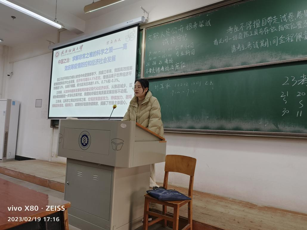 会上,班主任带领同学们回顾了三年以来,在抗击疫情中的点点滴滴;讲述了新中国成立以来我国遭遇的传播速度最快、感染范围最广、防控难度最大的重大突发公共卫生事件,以习近平同志为核心的党中央果断决策、沉着应对,举全国之力实施规模空前的生命大救援;解读了“中国之制”是如何战胜疫情,最终带领全国人民重新回到正常的生活。随着疫情防控政策的调整,班主任向同学们依次介绍了如何建设美好纺大,要分几步建设美好纺大,美好纺大预期的样子是什么等等,明确同学们的奋斗方向,激发同学们的奋斗热情,鼓励同学们为建设美好纺大添砖加瓦!
