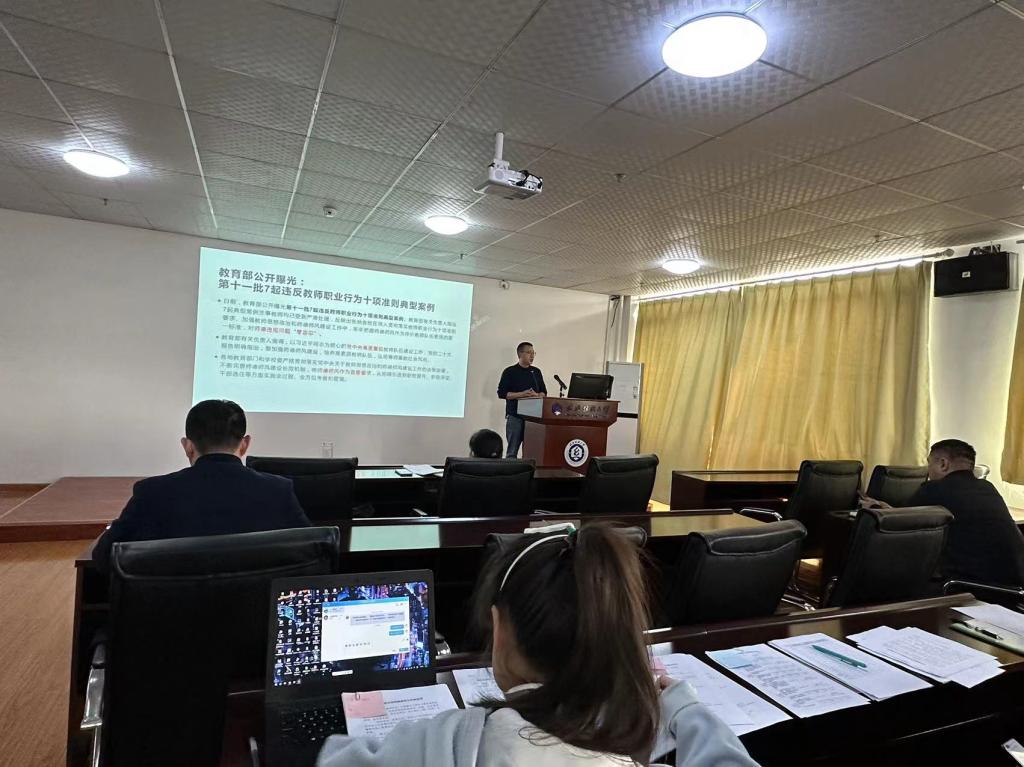 会上,晏伟带领全院教职工认真学习《新时代高校职业行为十项准则》、《高等学校教师职业道德规范》等文件,并通报了教育部近期公布曝光违反教师职业行为十项准则的典型案例,以案说法,开展了警示教育活动。