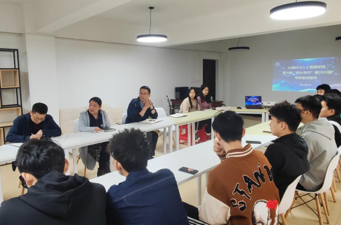 3月6日上午,计算机与人工智能学院在“1024”一站式学生社区服务中心举行了第六期“院长有约”暨2023届考研复试指导。院长胡新荣、副院长彭涛、党委副书记向涛以及毕业生辅导员孙榜骏及考研学生代表展开座谈交流。活动由孙榜骏主持。