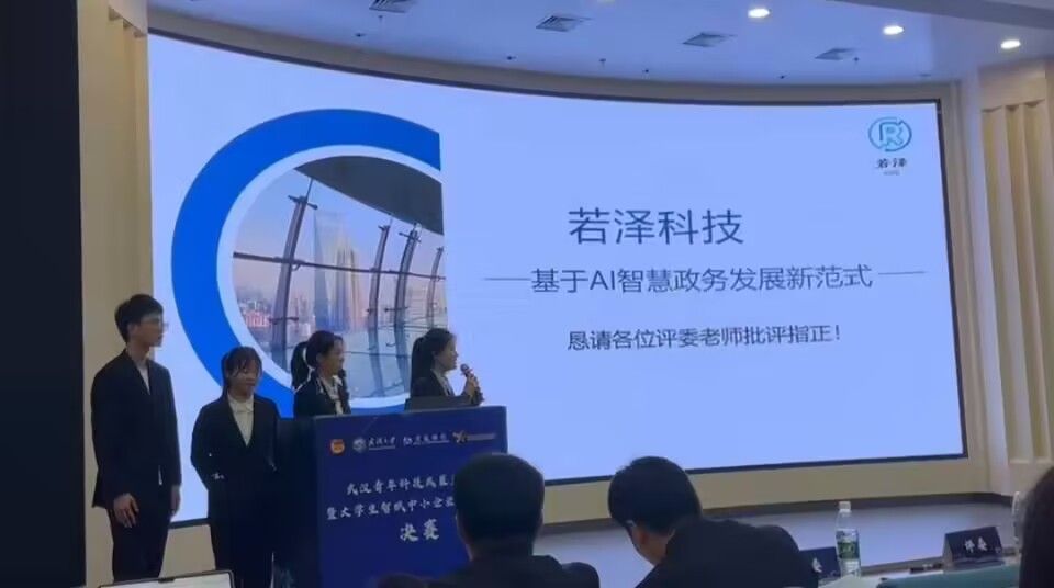 团市委书记皮惠兰介绍了2023年武汉青年科技成果直通车暨大学生智赋中小企业创新大赛开展情况。学院由李丽、胡新荣、朱强老师指导学生团队王玉欣、曹灿、马蒋啸天、陈珍、谢雨轩、马凯、周雅烯、朱思格主持的“若泽科技—基于 AI 智慧政务发展新范式”,与由朱强、彭涛、王帮超老师指导学生团队韩枫、洪铖,李幸阜、邓洋、邹致远主持的“基于知识图谱的基层治理智能化系统”两项项目入围决赛路演,经过激烈角逐获得“优胜奖”。