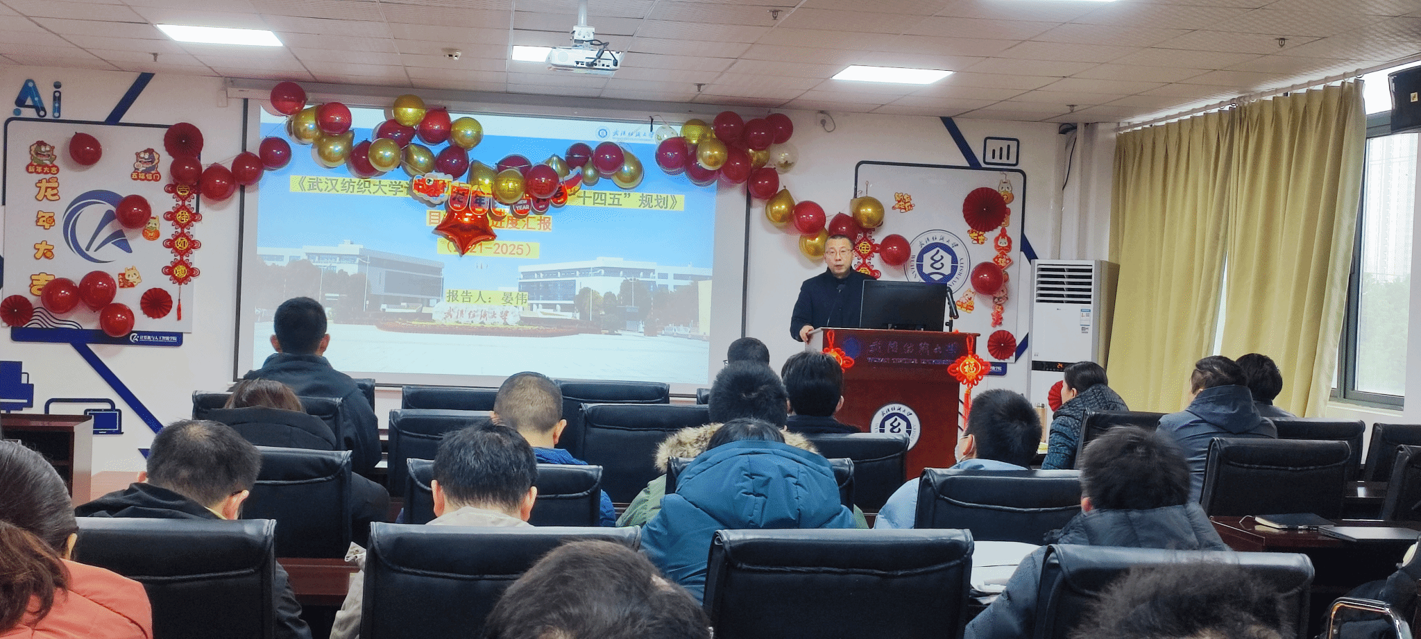 学院党委书记晏伟就《武汉纺织大学计算机与人工智能学院“十四五”规划》实施进展作了报告。报告详细阐述了学院在学科建设、科学研究、人才培养(包括本科生教育和研究生教育)、筹建“产教协同中心”、国际交流与合作、党建与思政建设等方面的进展和未来规划。
