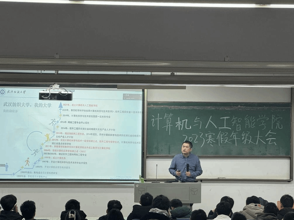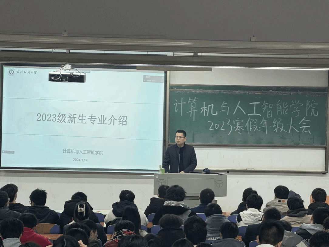为总结分析2023级新生大一上学期的整体情况,帮助学生充分了解所学专业信息,更好的利用寒假时间,做好专业学习规划。计算机与人工智能学院于1月14日在三号教学楼T202召开2023级寒假年级大会,副院长魏雄、学院党委副书记向涛、辅导员易凡、陈祯及2023级全体学生参会。会议由向涛主持。