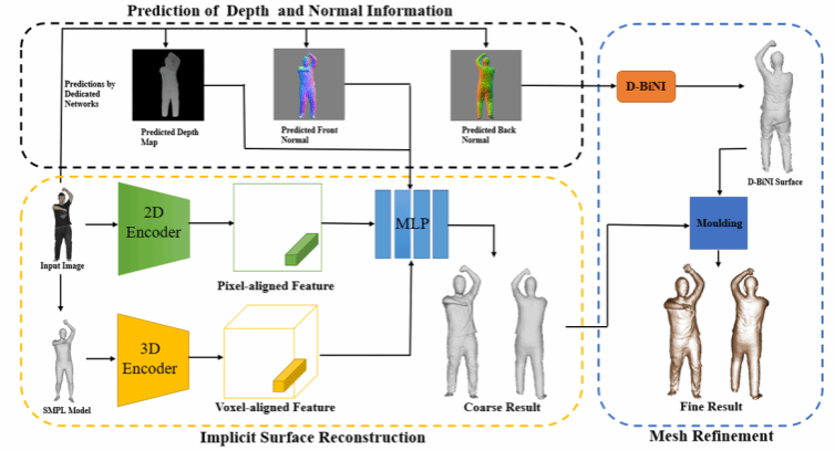 《PMDI: Combining Parametric-Model And Depth-Aware Implicit Function For Single-View Human Reconstruction》由钟赛尚和胡新荣教授共同指导完成。论文针对目前三维人体重建存在的肢体动作异常,重建精度不高,背部细节缺失等问题,提出了一种结合参数化模型和深度感知的隐式重建算法,该方法能够从单一RGB图像重建出包含服装的三维人体。首先通过优化的参数化人体模型监督全局几何特征提取,并将改进的参数化模型,前视法线图,深度先验作为参数来训练深度隐式函数。最终,我们将后视法线图转换为详细但不完整的D-BiNI表面,以修复粗糙结果,从而有效地解决了上述问题。实验结果表明,相较于传统方法,该方法有效提升了重建结果的整体质量和表面细节。