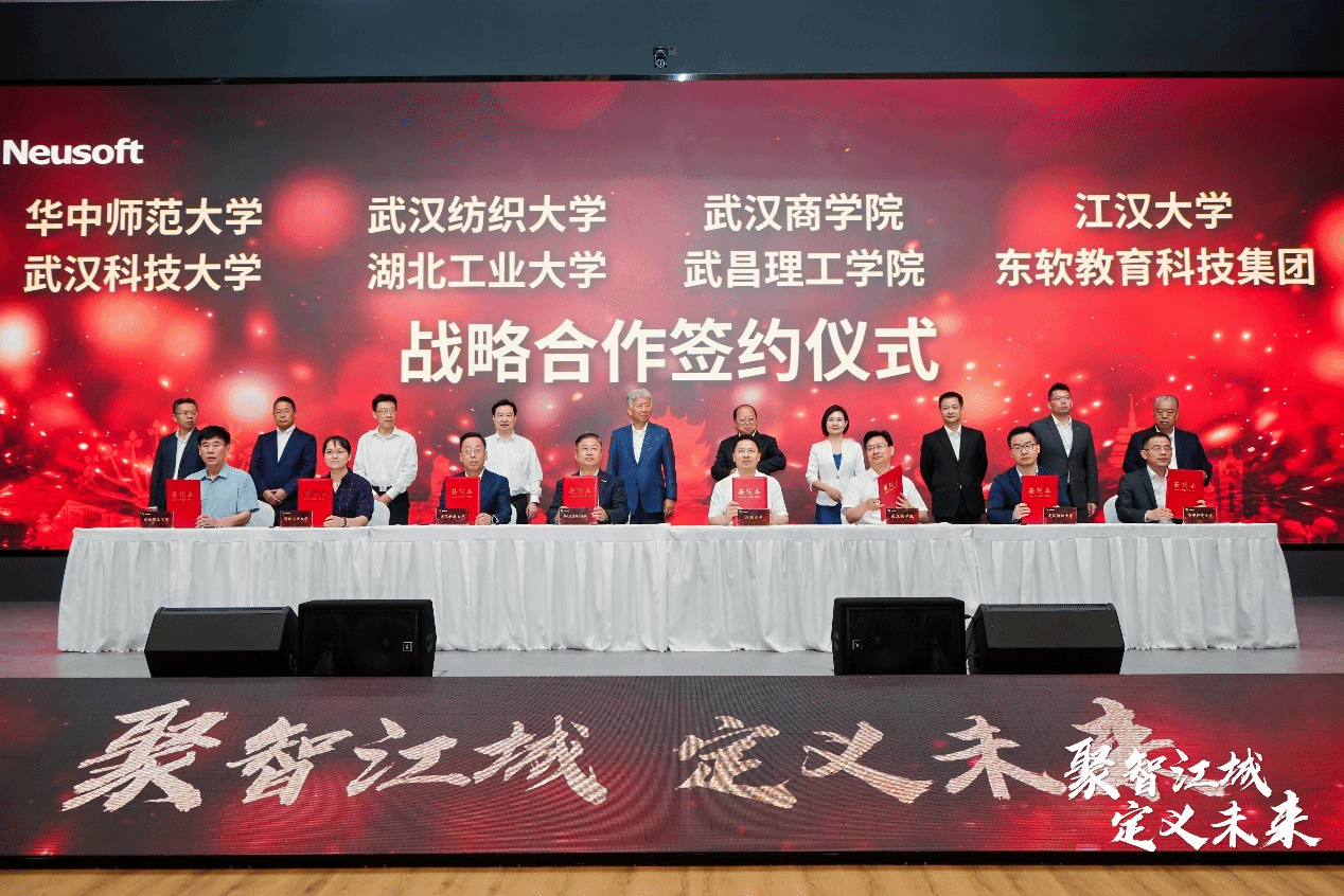 参加本次签约仪式的有华中师范大学、武汉科技大学、湖北工业大学、武汉纺织大学等七所高校。武汉市委常委、武汉经开区党工委书记刘子清,武汉市副市长汪元程,武汉经开区管委会主任唐超,东软创始人、董事长刘积仁,东软集团副董事长兼CEO荣新节等领导共同见证签约。