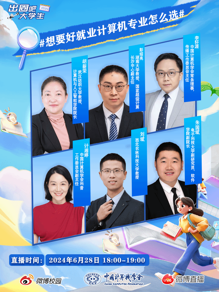 又到了高考填志愿的时候!为帮助考生、家长更全面地了解计算机、软件、人工智能等专业,更科学地填报志愿。6月28日下午,应中国计算机学会邀请,计算机与人工智能学院院长胡新荣和湖南大学、电子科技大学、西北农林大学等专家同台通过微博直播介绍各学校和学院。