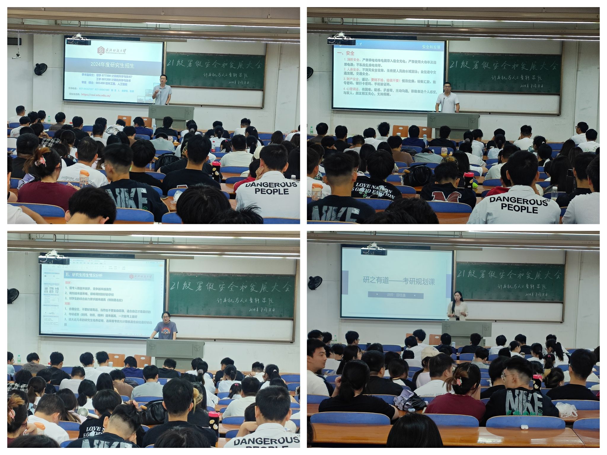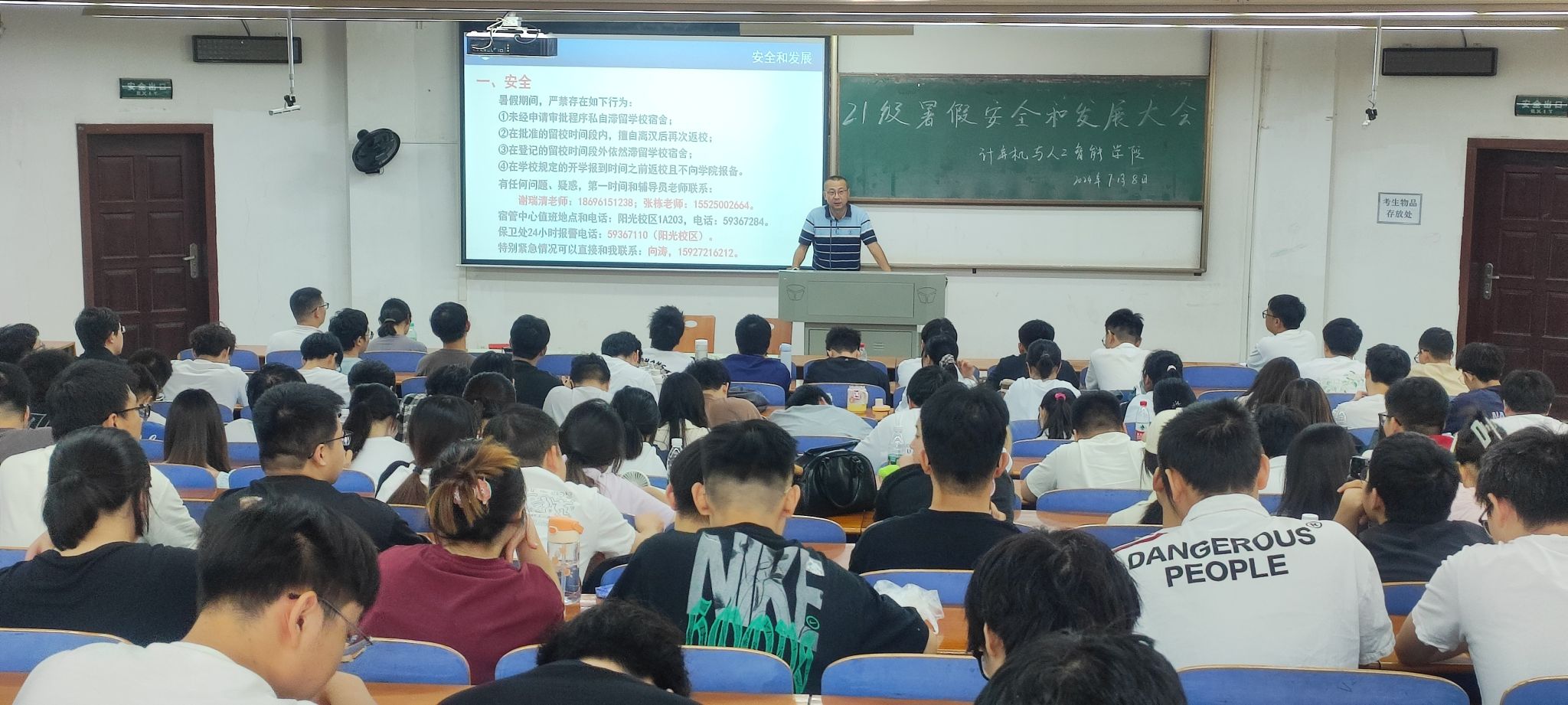 7月8日,计算机与人工智能学院于3号教学楼T102教室开展了2021级暑假留校学生安全和发展教育大会。全体院领导、计科系系主任陈佳、2021级辅导员谢瑞清、张栋及全体留校学生参加会议。大会以学生安全为基石,以考研和就业为航向,为留校学子们指引了前行的方向。