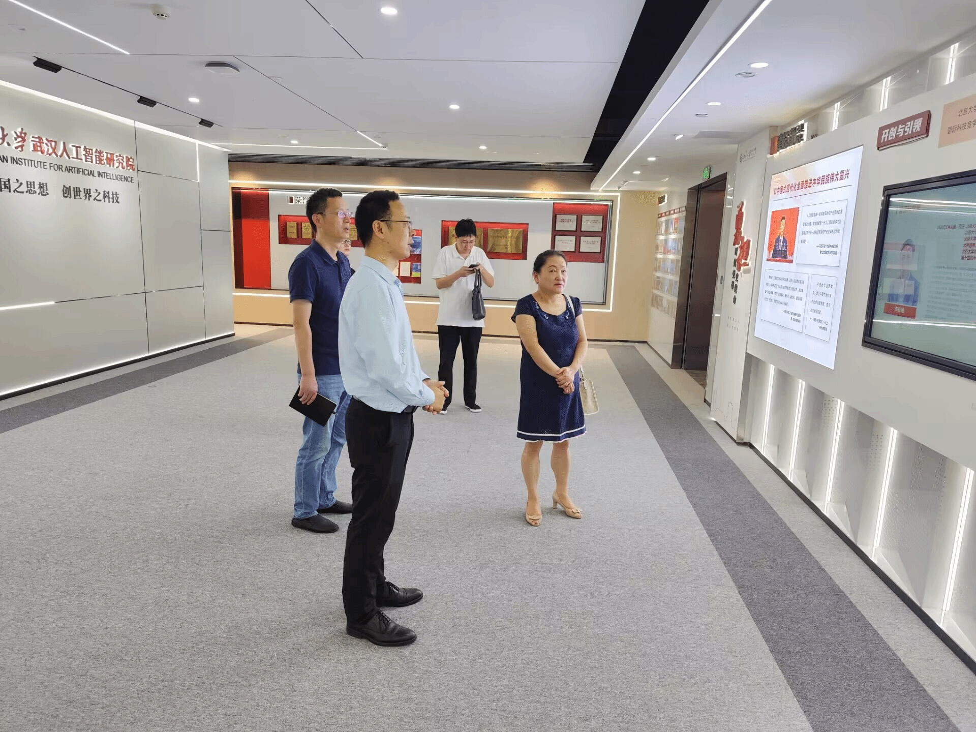 科技事务部部长李进带领胡新荣院长一行参观了北京大学武汉人工智能研究院展览馆,详细介绍了研究院的发展历程、研究方向、研究成果和与高校合作情况。