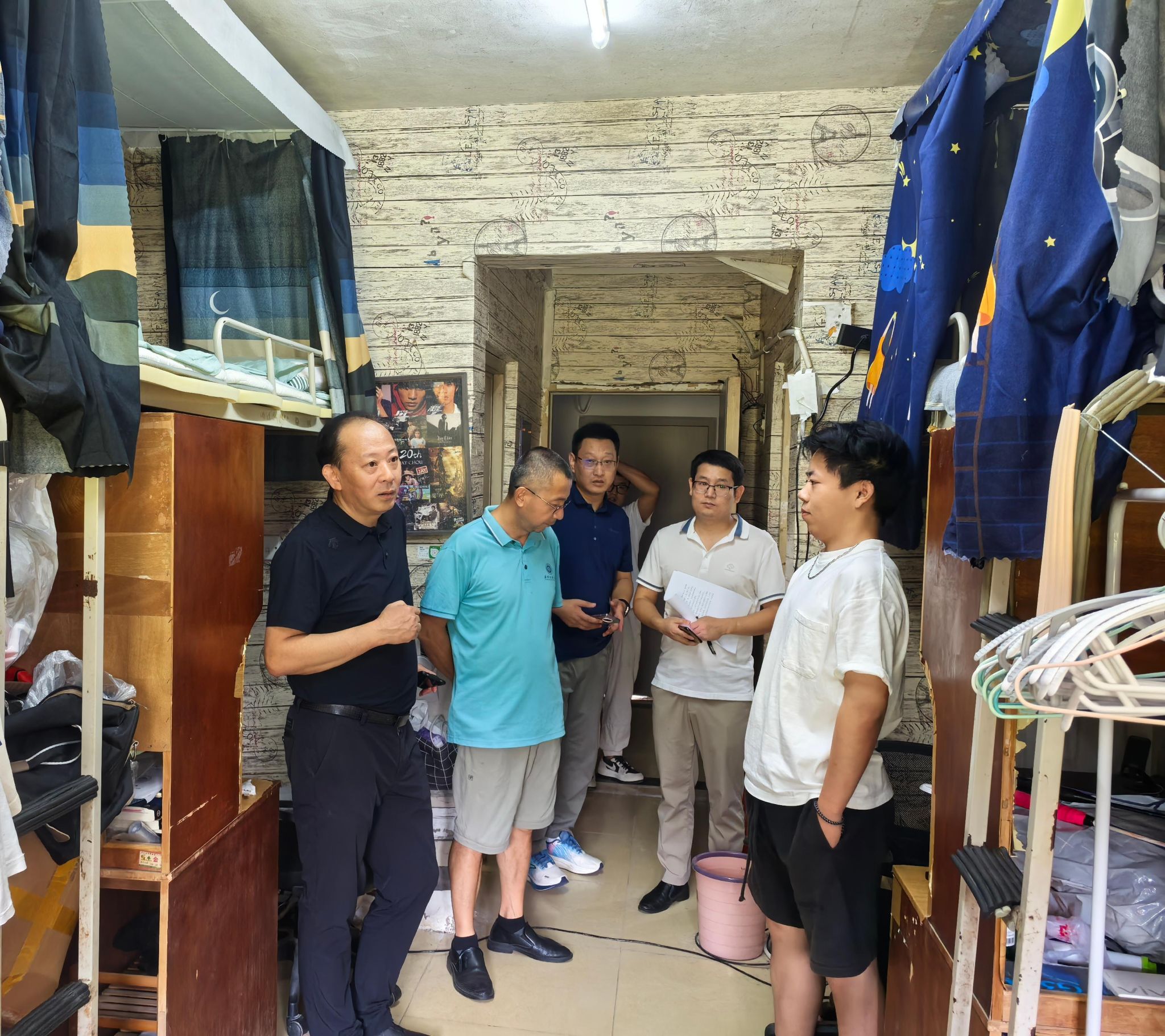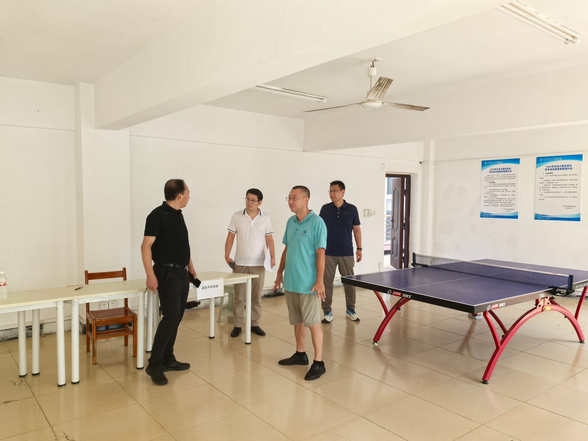 在五栋学生宿舍3楼学生活动室,冯军详细询问了关于活动室的使用情况、环境设置、场地维护等内容,肯定了学院对活动室的建设和使用,强调各项活动的开展要注意安全,要定期安排检修工作,确保活动室特色鲜明,环境优美。
