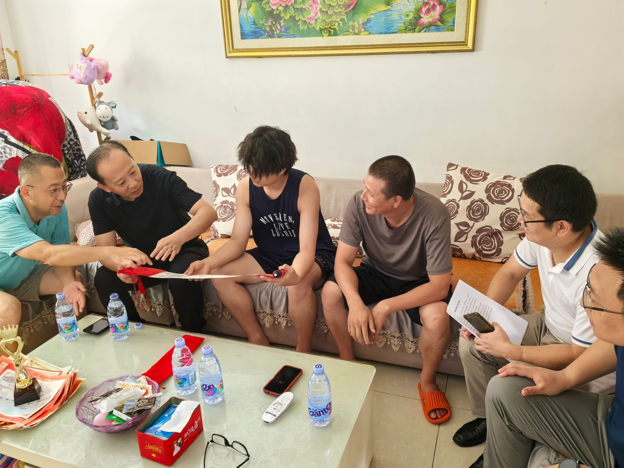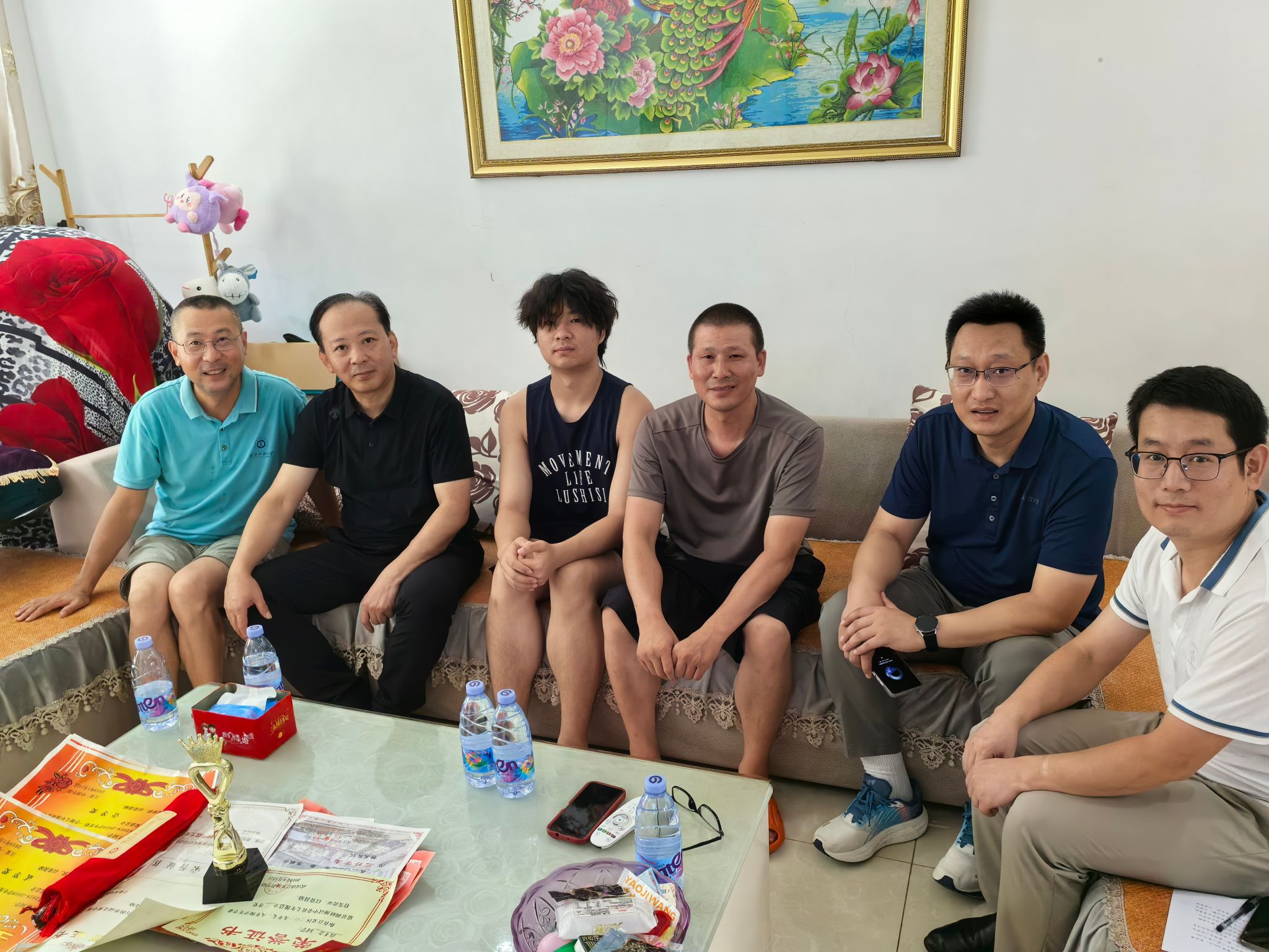 在武汉市江夏区人工智能12401班高才念的家中,高才念的爸爸热情地接待了冯军一行。冯军为学生及学生家长介绍了关于学校、学院的基本情况和近年来取得的辉煌成就,冯军强调2024届新生是幸运的一届,“你们录取通知书上有个小秘密,这个小挂件,它可是月面国旗的同款产品!”。听到这里,高才念与其父亲一同仔细观察着学校这份独特的纪念品。