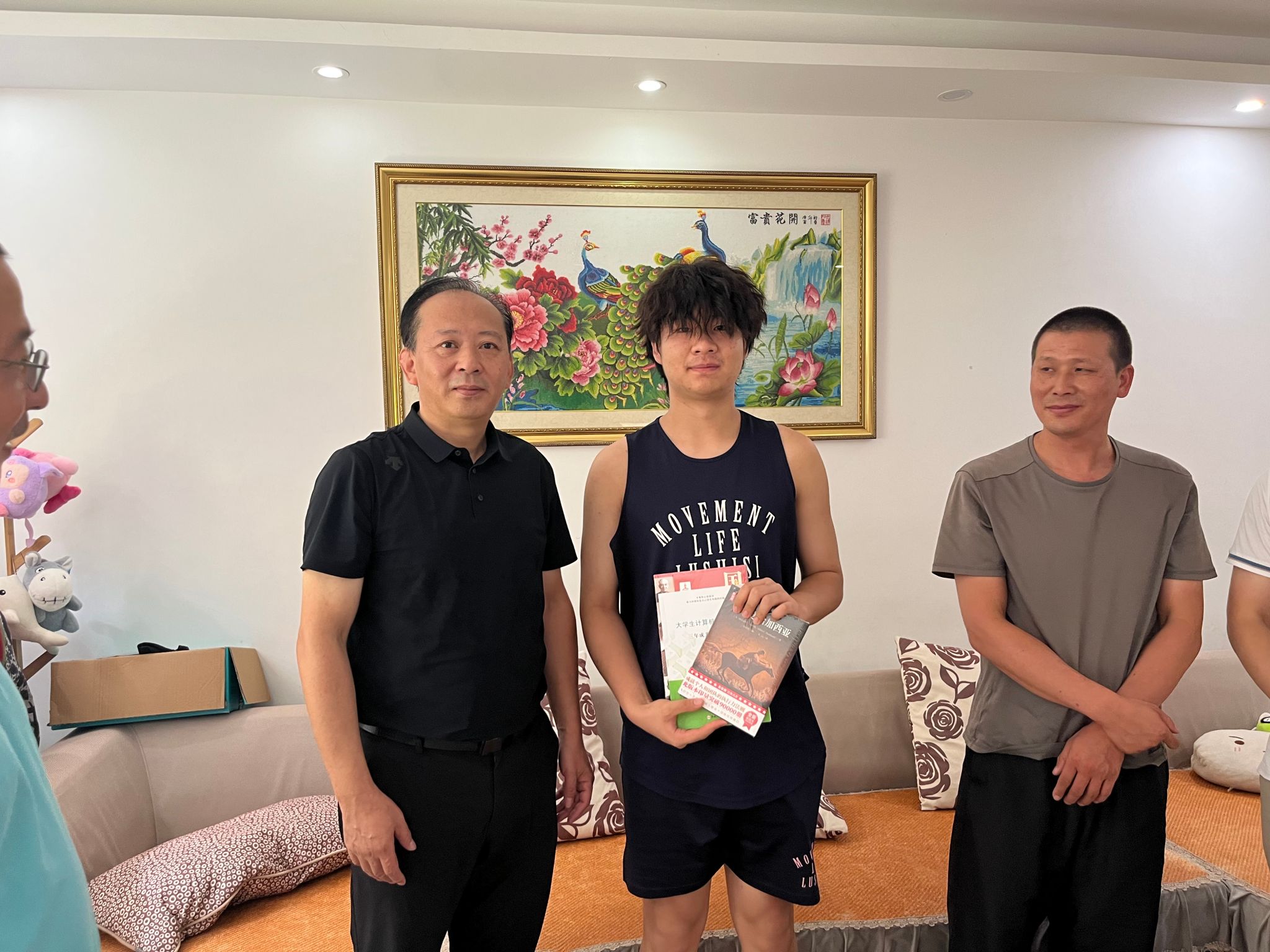 冯军注意到茶几下摆放着一叠厚厚的获奖证书,询问了高才念高中时期的获奖经历,对高才念成长道路上付出的努力表示肯定,鼓励他要坚持梦想,脚踏实地,把握住大学四年弥足珍贵的时光。最后,冯军赠予了高才念《国之栋梁》、《计算机专业大学生之路》和《把信送给加西亚》三本书籍,希望他能成为一名博学多才的新时代大学生。