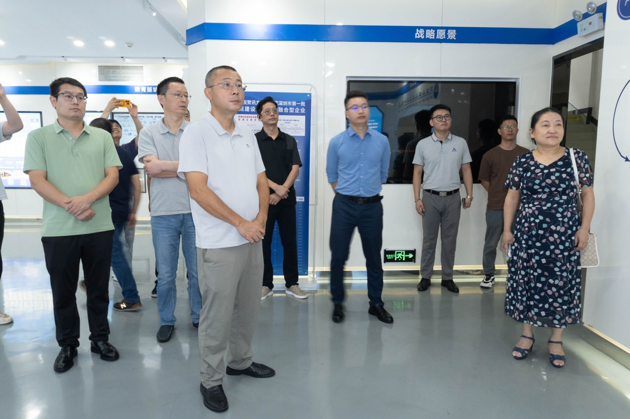 在深圳讯方科技有限公司,调研组首先参观了讯方文化展厅,深入了解了公司的发展历史、公司发展生态链、岗位模型(典型项目工作场景以及岗位需求模型)、(打造”一基地三中心数字人才培养体系”)、产教融合教学成果(介绍F5G全光校园网)、打造“一平台两中心三应用”智慧校园体系、建立工业软件产业学院、介绍专业课程体系和专业实训体系等。在与公司负责人进行座谈时双方重点就学生生产实训,技能提升以及师资培训等方面进行深入的交流并达成初步合作意向。