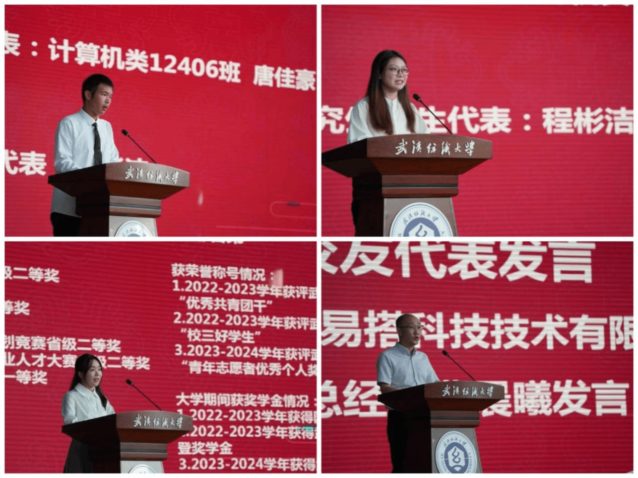 本科生新生代表唐佳豪和大家分享了自己选择计算机与人工智能学院的初心和历程。他表示作为计智学子,应当持续学习、保持热爱、努力奋斗,继承并发扬纺大精神。研究生新生代表程彬洁则为本科生分享了如何摆脱学习中的迷茫,并指出在研究生阶段需要注意的三大关键点:明确个人的学术目标、掌握扎实的专业技能、以及注重综合素质的全面提升。在校生代表周锦璇则从坚定理想、强健体魄、学会自我反思三个方面分享了自己在大学期间的经验。她鼓励新生们在大学这个成长平台上,全面提升自我,为今后的发展打下坚实的基础。2007级校友、深圳积木易搭科技有限公司副总经理曹晨曦作为校友代表发言,他感恩母校对自己的培养,分享了自己的学习经历和职场心得,从一个过来人和企业管理者的视角鼓励同学们夯实专业能力、提升软技能,珍惜时间,持续学习,不仅要学习专业知识,更要学习人文知识。