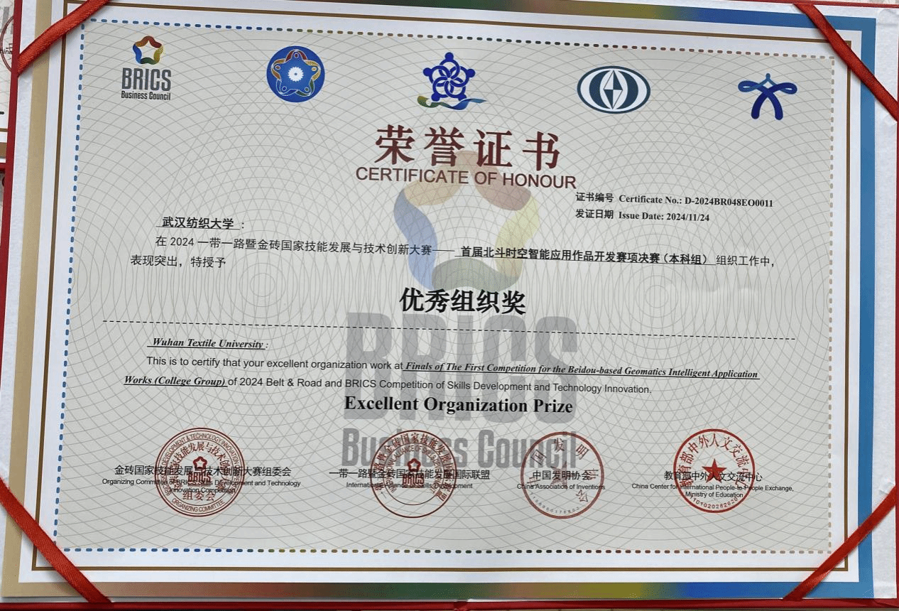 近日,由金砖国家工商理事会中方理事会、一带一路暨金砖国家技能发展国际联盟、中国科协“一带一路”暨金砖国家技能发展与技术创新培训中心主办的“2024一带一路暨金砖国家技能发展与技术创新大赛首届北斗时空智能应用作品开发赛项”决赛在武汉圆满落幕。计算机与人工智能学院学子在此次比赛中表现优异,荣获国家级二等奖,为学校争光添彩。