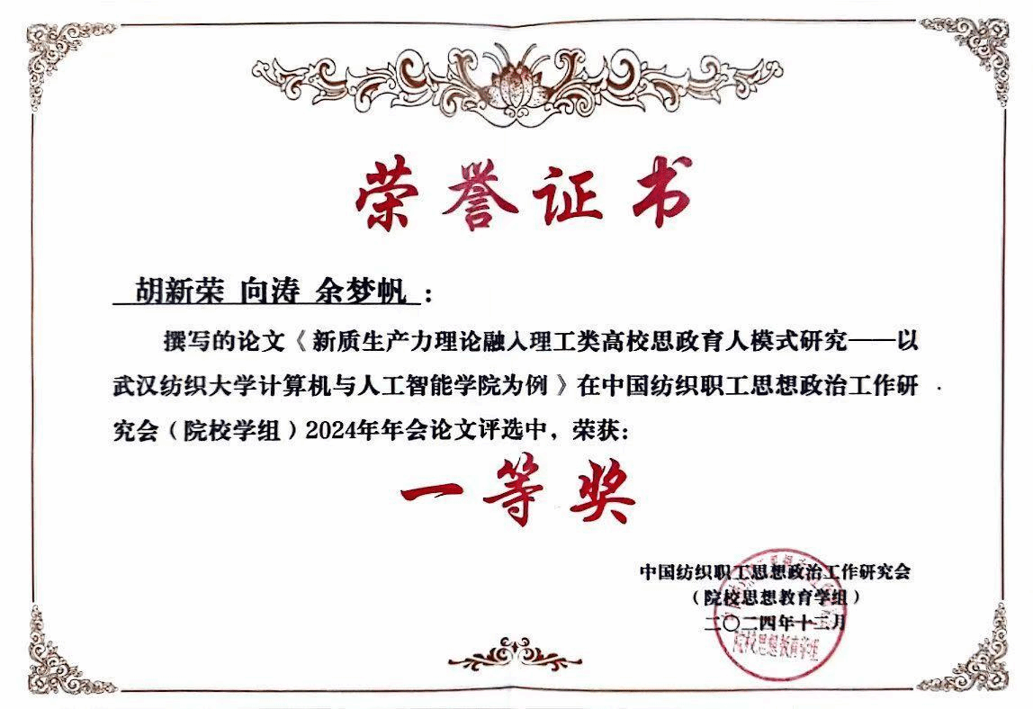 近日,我院胡新荣、向涛、余梦帆撰写的论文《新质生产力理论融入理工类高校思政育人模式研究——以武汉纺织大学计算机与人工智能学院为例》在中国纺织职工思想政治工作研究会(院校学组)2024年年会论文评选中荣获一等奖。