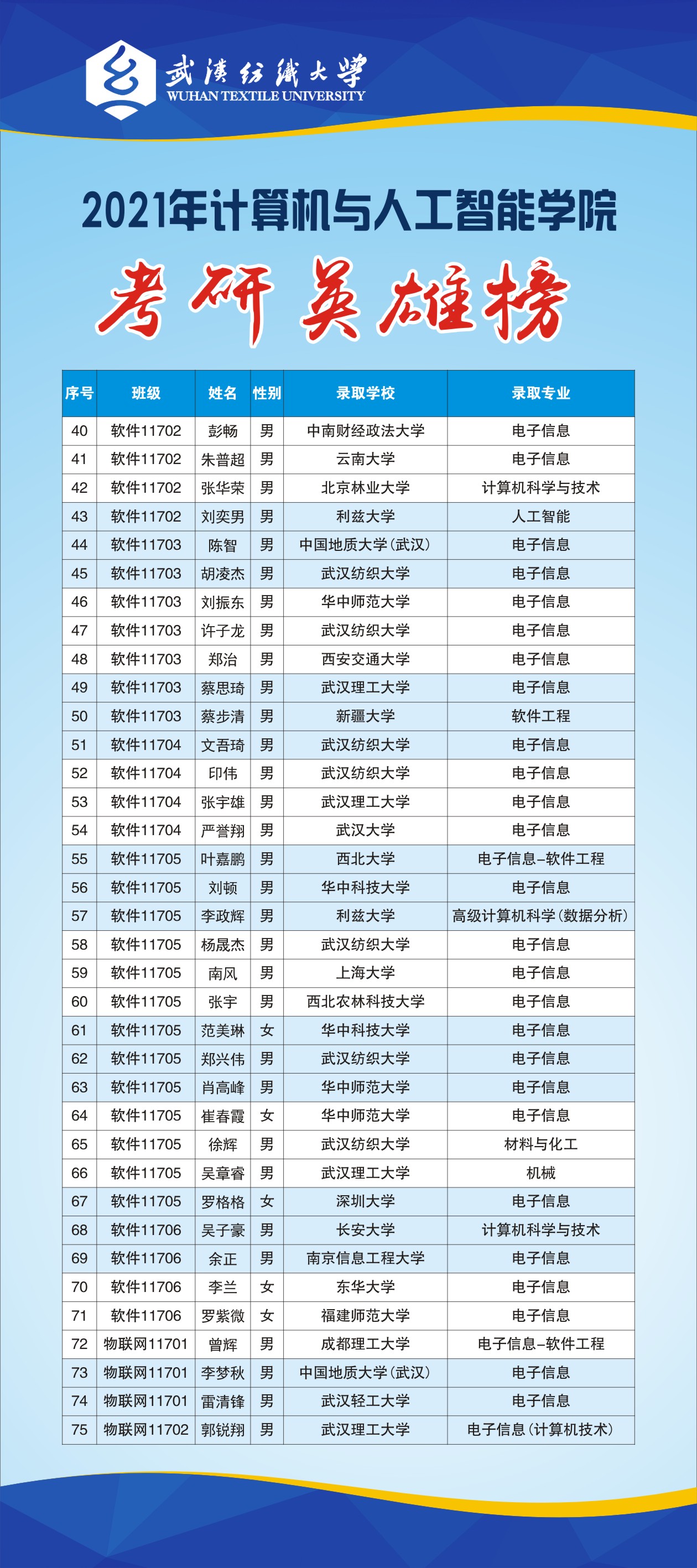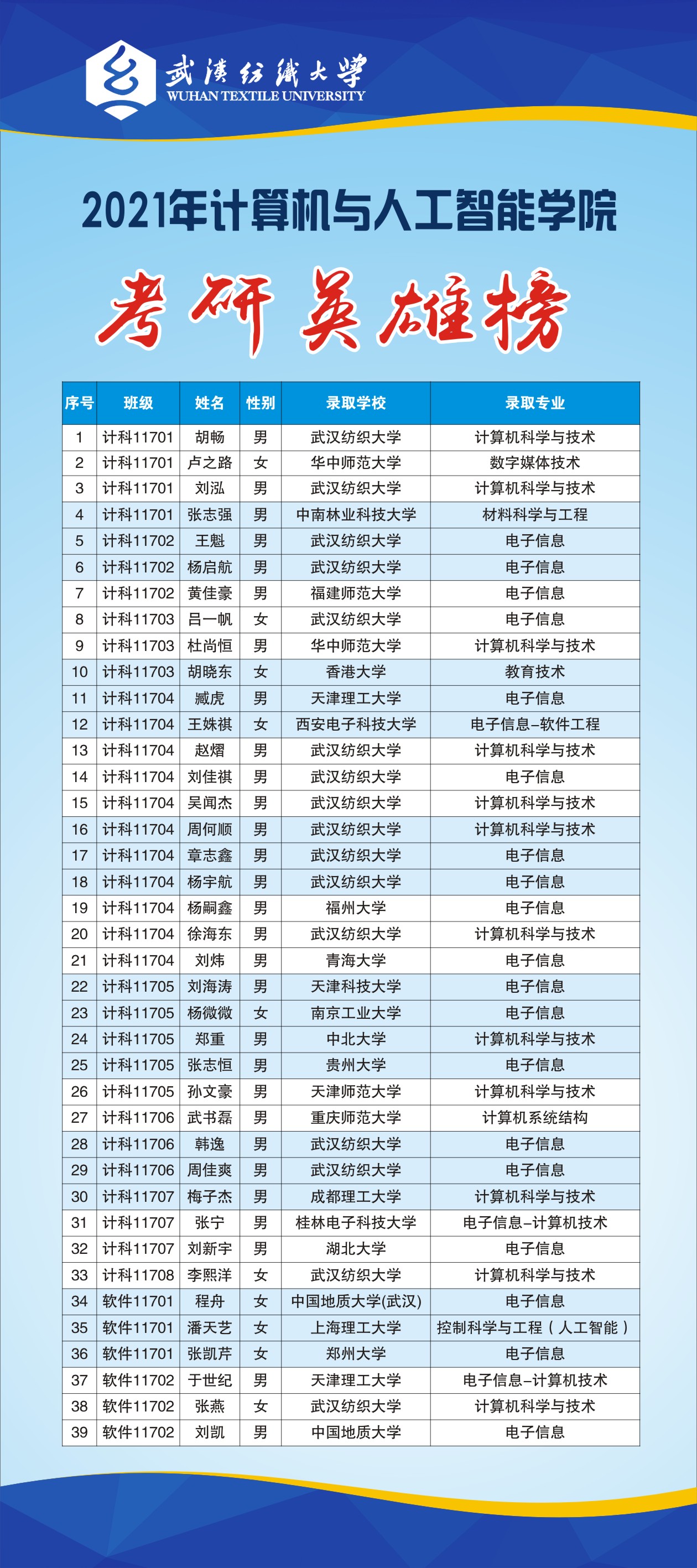 计算机与人工智能学院是武汉纺织大学规模较大,整体实力雄厚的院部之一。学院现有教职工90人,其中专业教师68人(高级职称37人,具有博士学历38人),是一支朝气蓬勃、富有潜力的教学科研团队。拥有全国优秀教育工作者、“湖北省名师工作室”、湖北省“程序设计课程群”教学团队、湖北省师德先进个人、“纺织之光”教师。现在校本科生1870人、研究生近200人。胡新荣教授获批“湖北名师工作室”主持人,16级张春帅同学是全国“自强之星”。