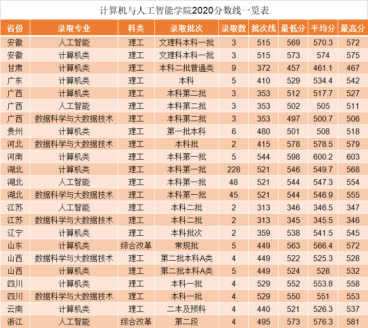 一、计算机与人工智能学院2020分数线