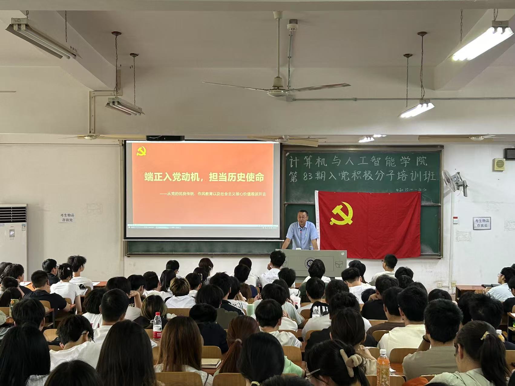 近日,计算机与人工智能学院分党校在阳光校区三号教学楼120教室举行第八十三期入党积极分子培训班暨入党积极分子专题党课,学院党委书记晏伟、各学生党支部书记出席,217名入党积极分子参加专题党课学习,会议由本科生第一党支部书记张栋主持。