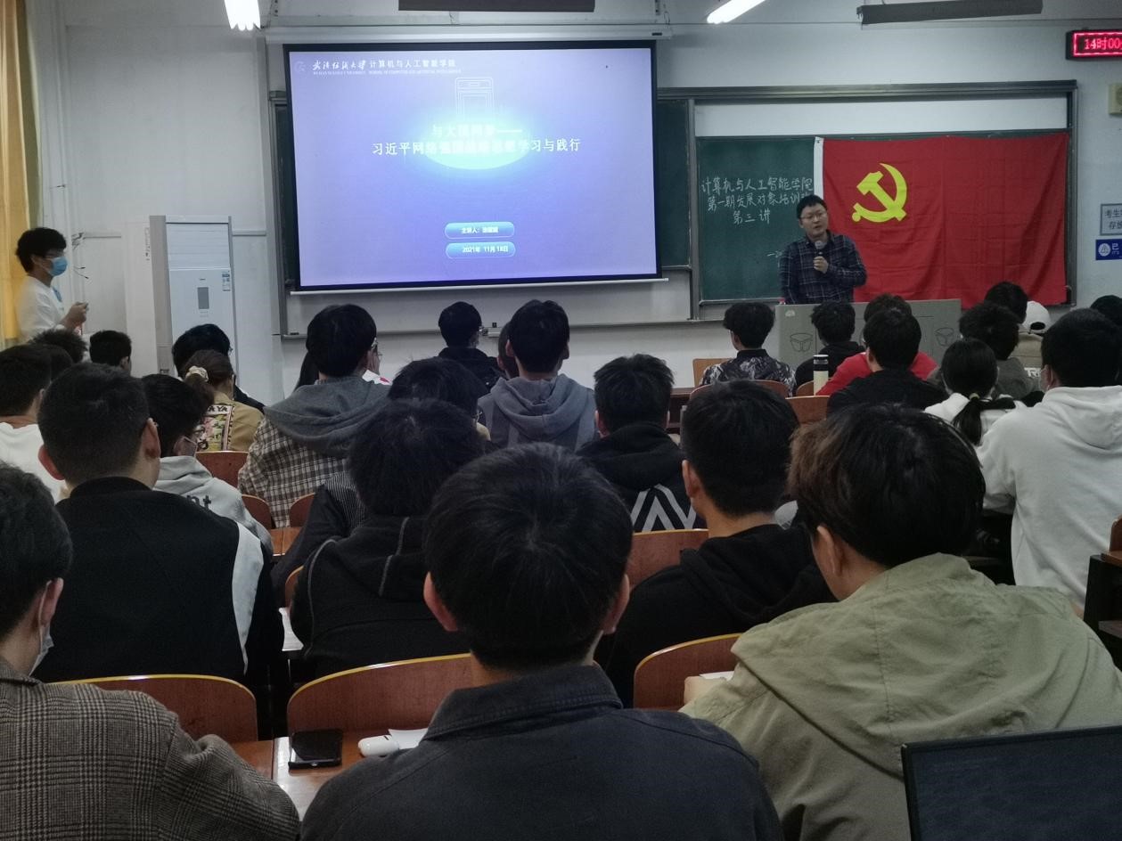 11月18日下午14:00,计算机与人工智能学院于崇志楼03-107,顺利开展第一期发展对象培训班第三讲,本次培训由学院党委副书记涂耀威主讲,培训以“习近平网络强国战略思想学习与践行”为主题。