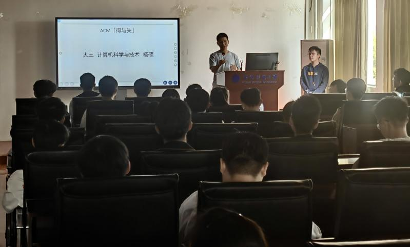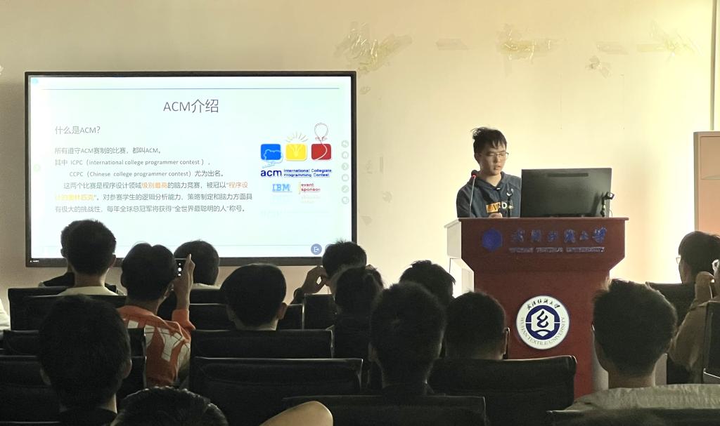 首先,由ACM俱乐部负责人雷宇涛同学为大家详细介绍什么是ACM,包括ACM的筛选赛制度和题目特点。同时我们还邀请到了种佳琪和杨硕两位优秀俱乐部代表及往届俱乐部负责人曹翔宇同学上台分享参赛经验。