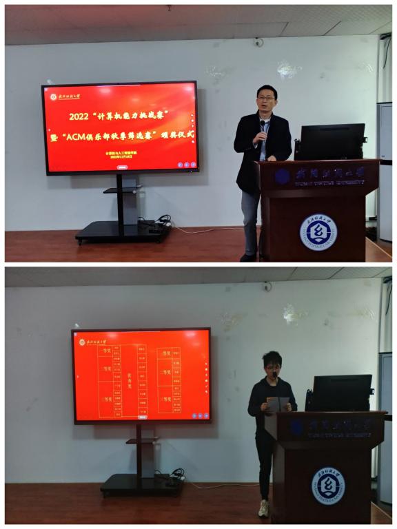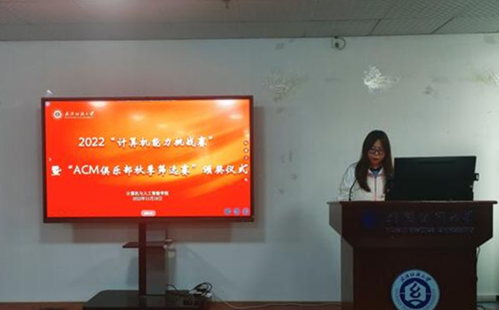 11月18日中午,计算机与人工智能学院在崇真楼(南楼)A4030顺利举行2022年“新生计算机能力挑战赛”暨“ACM俱乐部秋季筛选赛”颁奖仪式。学院副院长魏雄、彭涛、党委副书记向涛、2022级辅导员廖龙、1024工作室负责人孙榜骏出席了典礼。仪式由团委学生会学术科技部分管主席梁鸣岩主持。