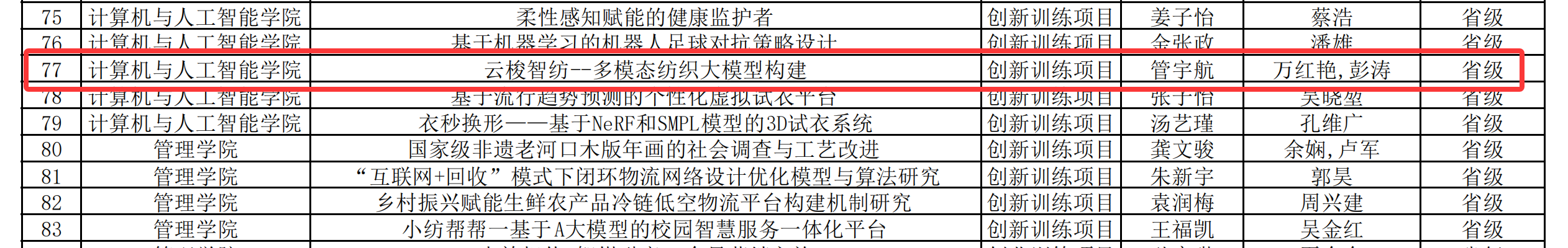 6月12日,学校创新创业学院公布了2025年大学生创新创业训练计划的获批项目清单,本年度获批项目总计170项,其中国家级30项、省级90项、校级50项。由计算机与人工智能学院2024级“拔尖创新班”管宇航、刘攀、黄汪洋等同学组成的学生团队,所申请的项目《云梭智纺--多模态纺织大模型构建》成功获批省级立项,该项目的指导老师为副院长彭涛教授和万红艳老师。