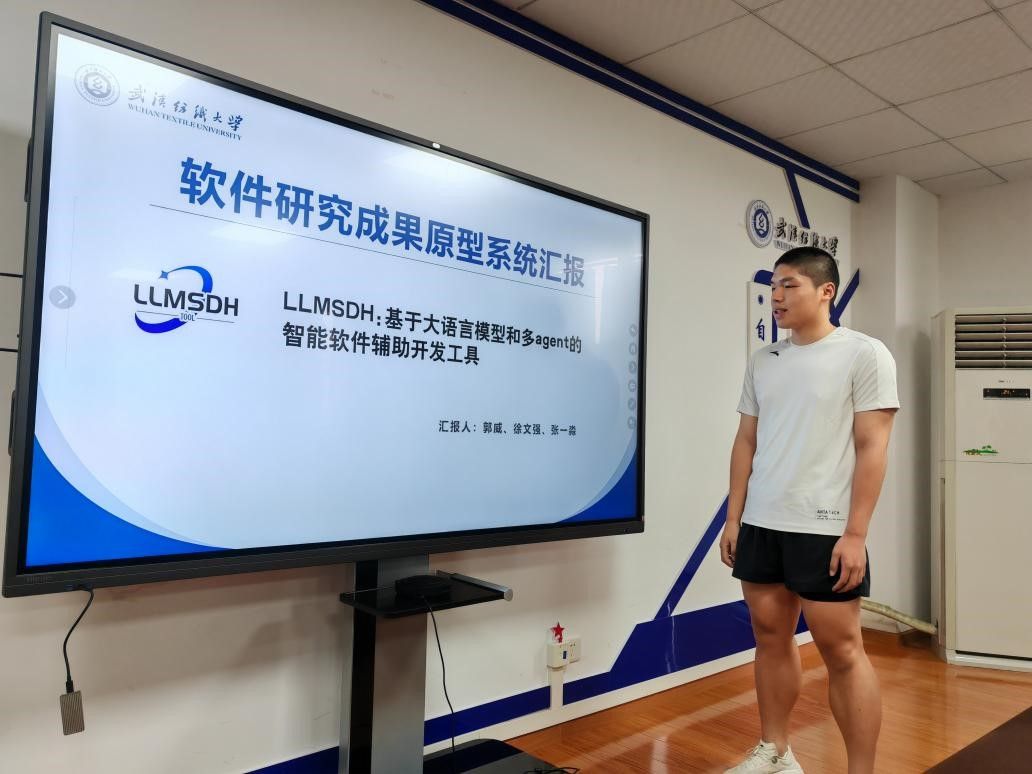 本次论坛由三组本科生汇报了他们即将参赛的作品。软件12202班郭威同学介绍了他们小组开发的LLMSDH工具,该工具是一款智能软件辅助开发工具,结合大语言模型和多agent技术,具备自动代码生成、代码缺陷检测和软件项目分析功能,同时提高了开发效率,帮助用户简化开发流程。