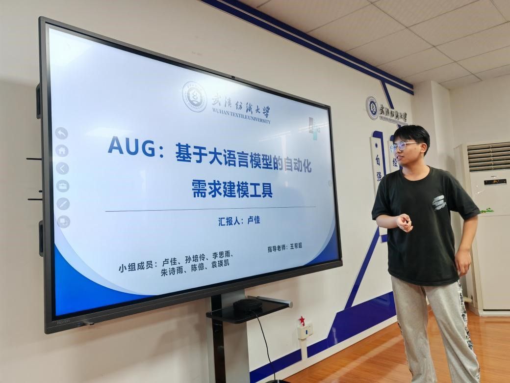 软件12201班卢佳同学介绍了他们小组开发的AUG工具。AUG是一款基于大语言模型的自动化需求建模工具。它通过解析用户输入的需求描述,自动生成PlantUML代码并实时转化为UML图,同时具备对生成图形的质量进行科学评价的能力。工具采用Vue框架构建用户友好的界面,结合提示微调技术,实现了需求到设计图的快速转换,并提供针对生成结果的优化建议。